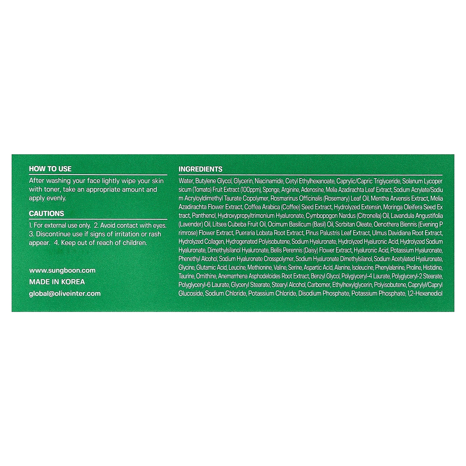 Water, butylene glycol, glycerin, niacinamide, cetyl ethylhexanoate, caprylic/capric triglyceride, solanum lycopersicum (tomato) fruit extract (100ppm), sponge, arginine, adenosine, melia azadirachta leaf extract, sodium acrylate/sodium acryloyldimethyl taurate copolymer, rosmarinus officinalis (rosemary) leaf oil, mentha arvensis extract, melia azadirachta flower extract, coffea arabica (coffee) seed extract, hydrolyzed extensin, moringa oleifera seed extract, panthenol, hydroxypropyltrimonium hyaluronate, cymbopogon nardus (citronella) oil, lavandula angustifolia (lavender) oil, litsea cubeba fruit oil, ocimum basilicum (basil) oil, sorbitan oleate, oenothera biennis (evening primrose) flower extract, pueraria lobata root extract, pinus palustris leaf extract, ulmus davidiana root extract, hydrolyzed collagen, hydrogenated polyisobutene, sodium hyaluronate, hydrolyzed hyaluronic acid, hydrolyzed sodium hyaluronate, dimethylsilanol hyaluronate, bellis perennis (daisy) flower extract, hyaluronic acid, potassium hyaluronate, phenethyl alcohol, sodium hyaluronate crosspolymer, sodium hyaluronate dimethylsilanol, sodium acetylated hyaluronate, glycine, glutamic acid, leucine, methionine, valine, serine, aspartic acid, alanine, isoleucine, phenylalanine, proline, histidine, taurine, ornithine, anemarrhena asphodeloides root extract, benzyl glycol, polyglyceryl-4 laurate, polyglyceryl-2 stearate, polyglyceryl-6 laurate, glyceryl stearate, stearyl alcohol, carbomer, ethylhexylglycerin, polyisobutene, caprylyl/capryl glucoside, sodium chloride, potassium chloride, disodium phosphate, potassium phosphate, 1,2-hexanediol.
