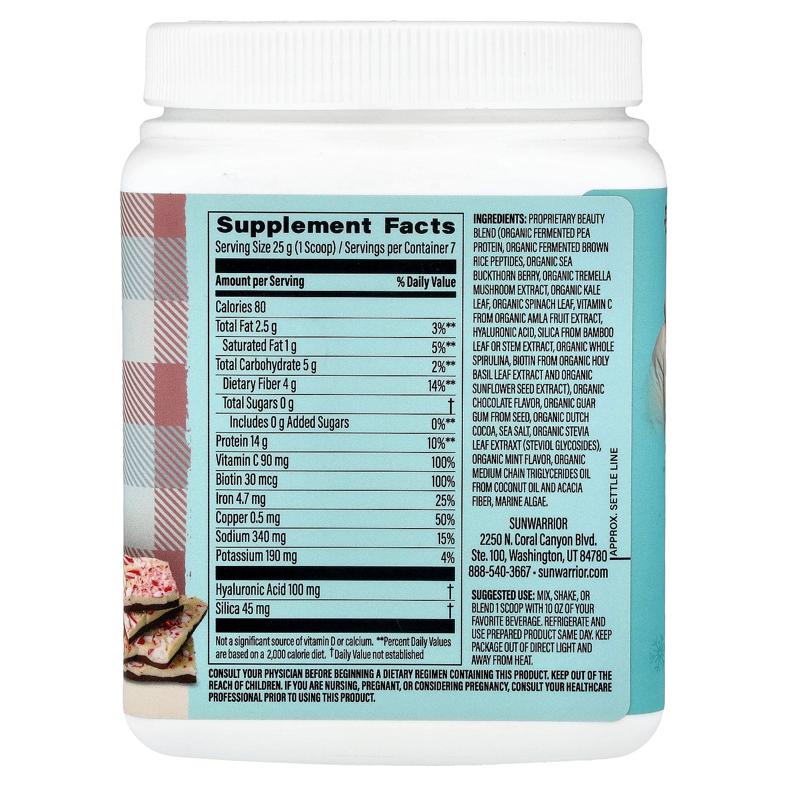 Proprietary beauty blend (organic fermented pea protein, organic fermented brown rice peptides, organic sea buckthorn berry, organic tremella mushroom extract, organic kale leaf, organic spinach leaf, vitamin c from organic amla fruit extract, hyaluronic acid, silica from bamboo leaf or stem extract, organic whole spirulina, biotin from organic holy basil leaf extract and organic sunflower seed extract), organic chocolate flavor, organic guar gum from seed, organic dutch cocoa, sea salt, organic stevia leaf extract (steviol glycosides), organic mint flavor, organic medium chain triglycerides oil from coconut oil and acacia fiber, marine algae.