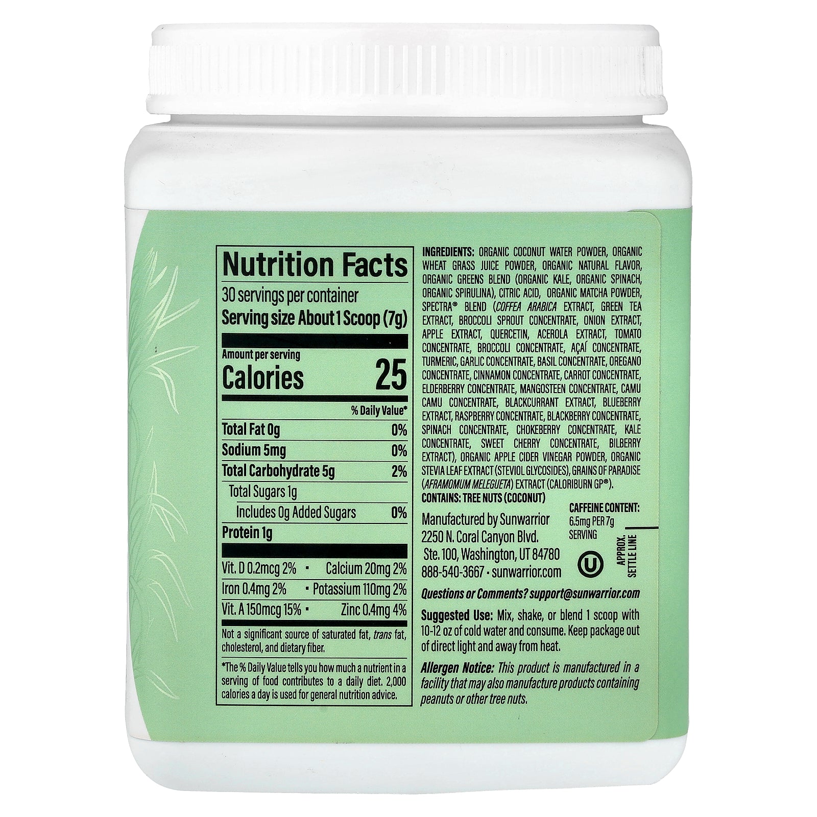 Organic coconut water powder, organic wheat grass juice powder, organic natural flavor, organic greens blend (organic kale, organic spinach, organic spirulina), citric acid, organic matcha powder, spectra® blend (coffea arabica extract, green tea extract, broccoli sprout concentrate, onion extract, apple extract, quercetin, acerola extract, tomato concentrate, broccoli concentrate, açaí concentrate, turmeric, garlic concentrate, basil concentrate, oregano concentrate, cinnamon concentrate, carrot concentrate, elderberry concentrate, mangosteen concentrate, camu camu concentrate, blackcurrant extract, blueberry extract, raspberry concentrate, blackberry concentrate, spinach concentrate, chokeberry concentrate, kale concentrate, sweet cherry concentrate, bilberry extract), organic apple cider vinegar powder, organic stevia leaf extract (steviol glycosides), grains of paradise (aframomum melegueta) extract (caloriburn GP®).