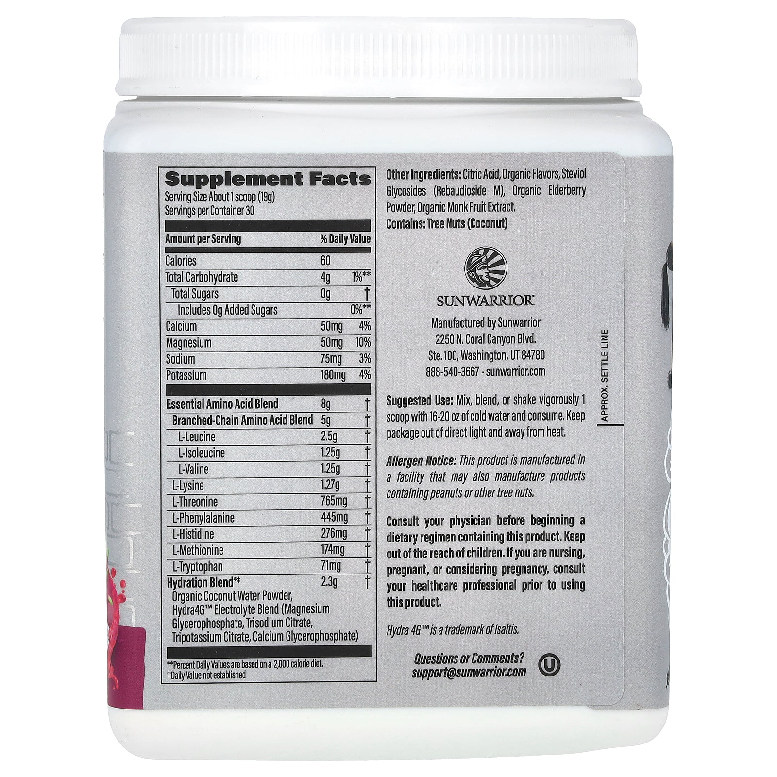 Hydration Blend Organic coconut water powder, Hydra4G™ Electrolyte blend (magnesium glycerophosphate, trisodium citrate, tripotassium citrate, calcium glycerophosphate) |