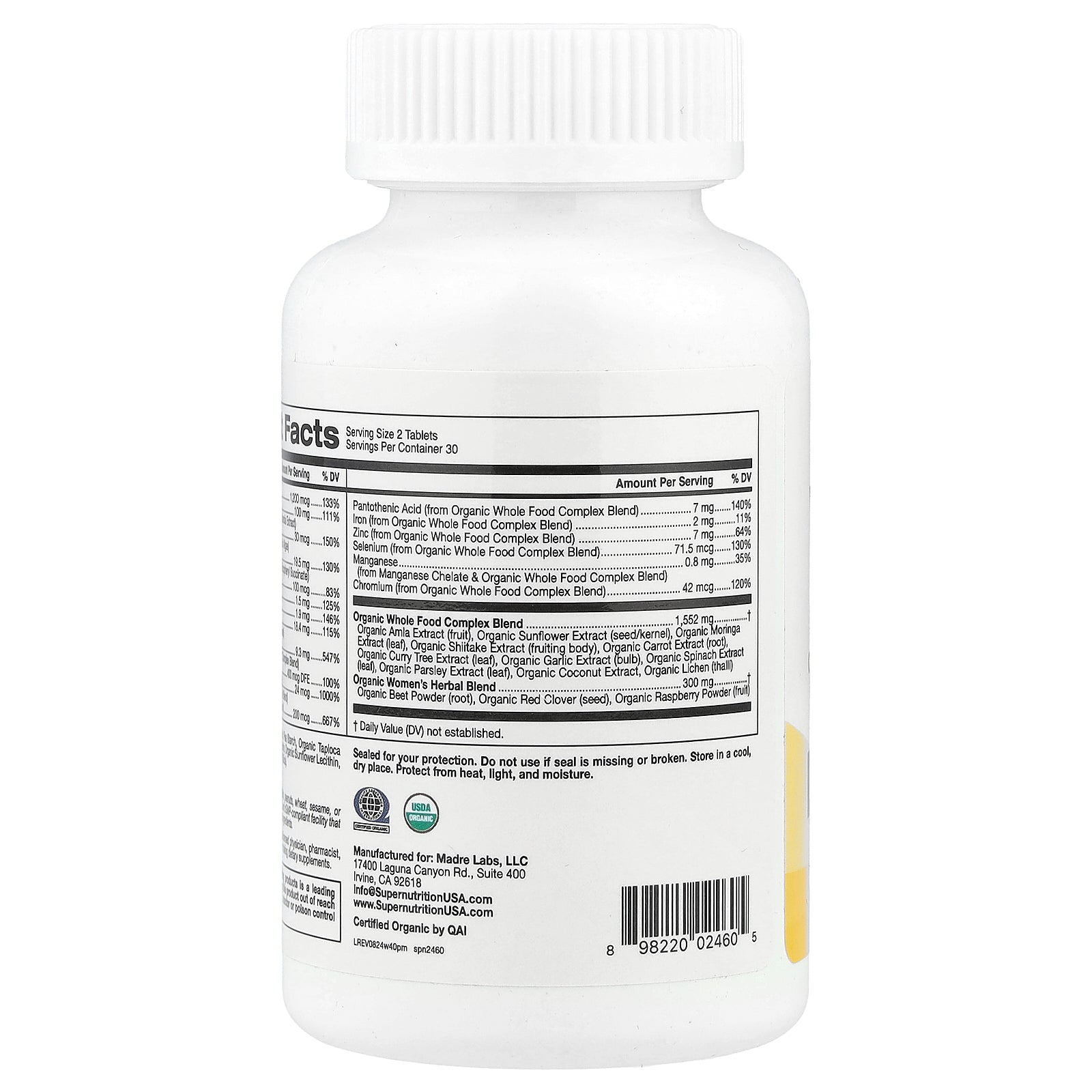 Vitamin A (from Organic Whole Food Complex Blend), Vitamin C (from Organic Whole Food Complex Blend & Organic Acerola Extract), Vitamin D3 (from Organic Whole Food Complex Blend & Organic Algae), Vitamin E (from Organic Whole Food Complex Blend & as d-alpha Tocopheryl Succinate), Vitamin K (from Organic Whole Food Complex Blend), Thiamine (from Organic Whole Food Complex Blend), Riboflavin (from Organic Whole Food Complex Blend), Niacin (as Niacinamide & from Organic Whole Food Complex Blend), Vitamin B6 (as Pyridoxine Hydrochloride & from Organic Whole Food Complex Blend), Folate (from Organic Whole Food Complex Blend), Vitamin B12 (as Methylcobalamin & from Organic Whole Food Complex Blend), Biotin (from d-Biotin and from Organic Whole Food Complex Blend), Pantothenic Acid (from Organic Whole Food Complex Blend), Iron (from Organic Whole Food Complex Blend), Zinc (from Organic Whole Food Complex Blend), Selenium (from Organic Whole Food Complex Blend), Manganese (from Manganese Chelate & Organic Whole Food Complex Blend), Chromium (from Organic Whole Food Complex Blend), Organic Whole Food Complex Blend: Organic Amla Extract (fruit), Organic Sunflower Extract (seed/kernel), Organic Moringa Extract (leaf), Organic Shiitake Extract (fruiting body), Organic Carrot Extract (root), Organic Curry Tree Extract (leaf), Organic Garlic Extract (bulb), Organic Spinach Extract (leaf), Organic Parsley Extract (leaf), Organic Coconut Extract, Organic Lichen (thalli). Organic Women's Herbal Blend: Organic Beet Powder (root), Organic Red Clover (seed), Organic Raspberry Powder (fruit).