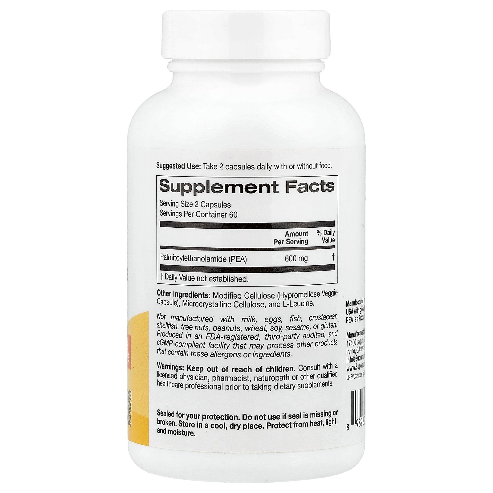 Support your health with our Super Nutrition® Palmitoylethanolamide (PEA). This 600 mg per serving formula is a high-quality fatty acid amide designed to support your body's natural balance. We rigorously test for quality, and proudly offer a product suitable for vegans.