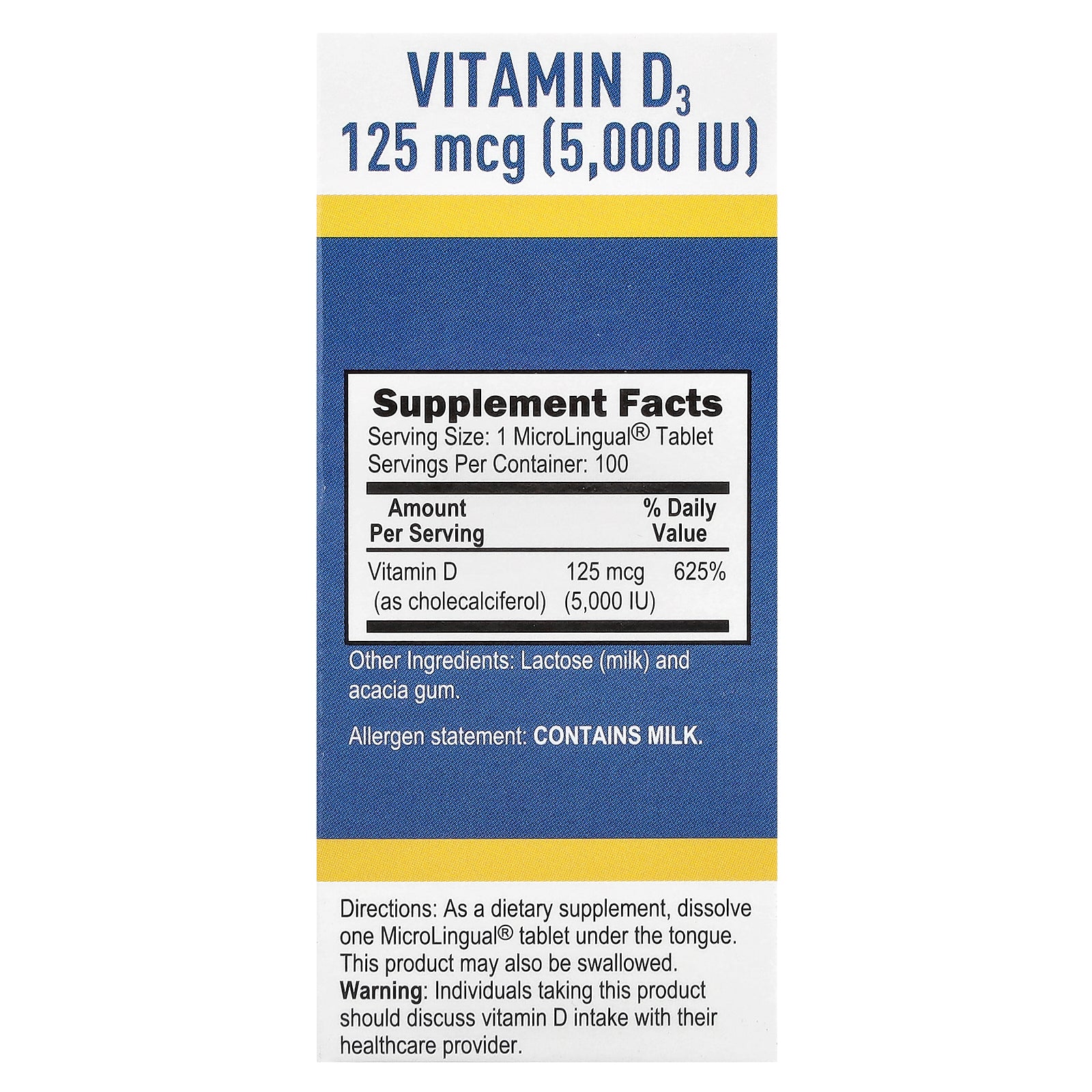 | Vitamin D (as cholecalciferol) | 125 mcg (5,000 IU) | 625% |