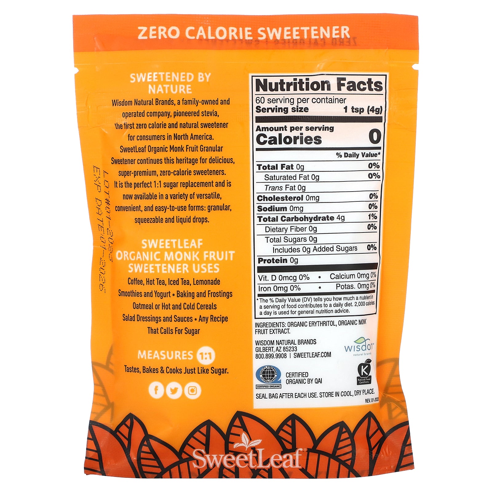 Wisdom Natural Brands, a family-owned and operated company, pioneered stevia, the first zero calorie and natural sweetener for consumers in North America. SweetLeaf Organic Monk Fruit Granular Sweetener continues this heritage for delicious, super-premium, zero-calorie sweeteners. It is the perfect 1:1 sugar replacement and is now available in a variety of versatile, convenient, and easy-to-use forms: granular, squeezable and liquid drops.