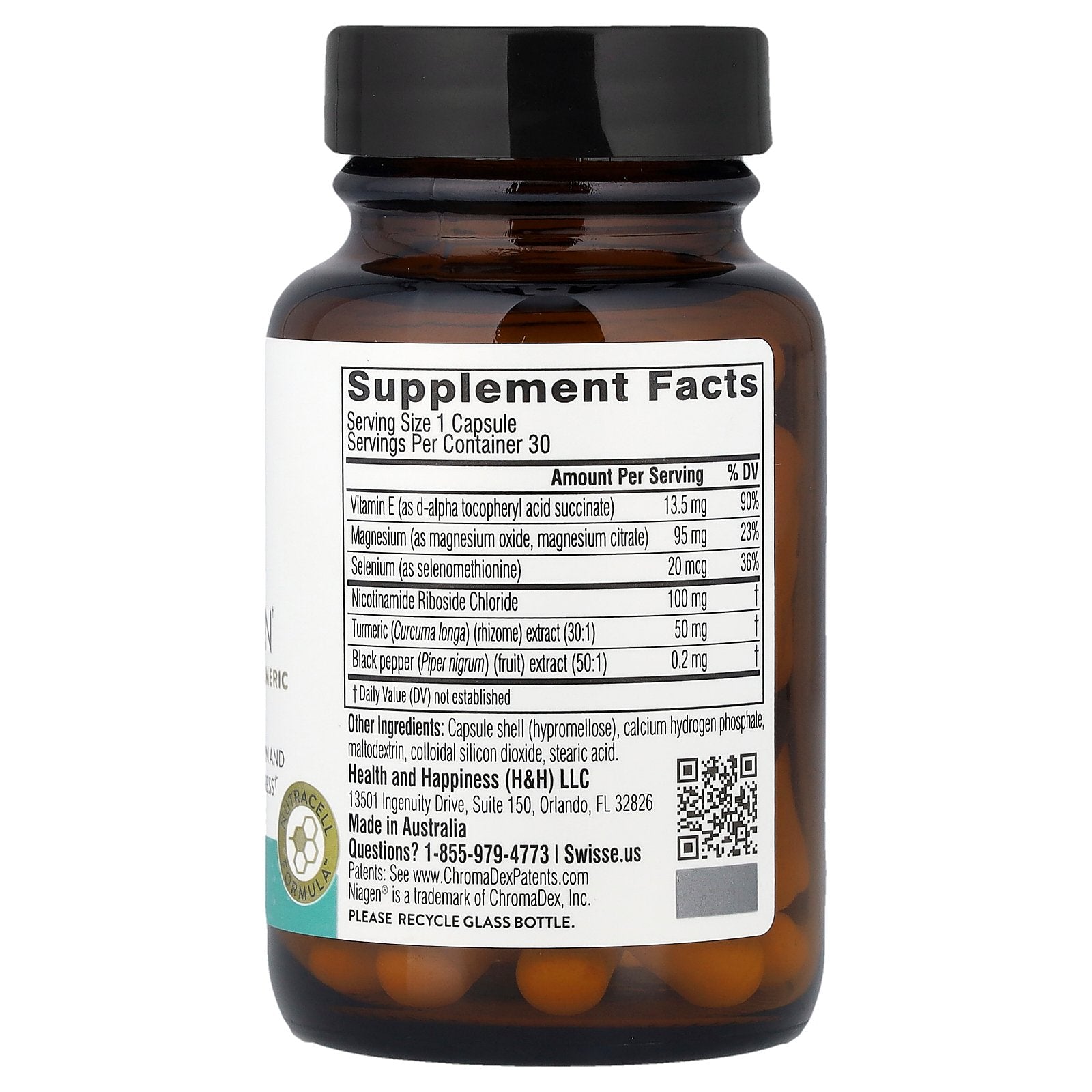 Nicotinamide Riboside Chloride (NR, Niagen®), a precursor of Nicotinamide Adenine Dinucleotide (NAD), is important for cellular energy metabolism and a bioactive source of Nicotinamide to support energy production & vitality. Swisse Plus NAD + Calm Skin is uniquely formulated with NR, turmeric & magnesium for premium beauty benefits.