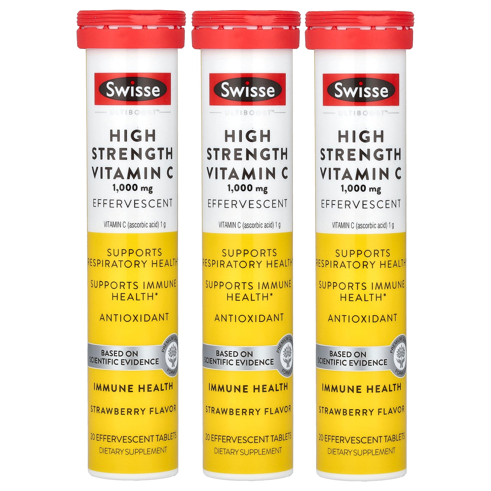 Swisse Ultiboost High Strength Vitamin C Effervescent has been formulated based on scientific evidence to provide vitamin C in a convenient once daily dose. This natural strawberry flavored formula is an alternative for those who have difficulty swallowing large tablets or capsules.