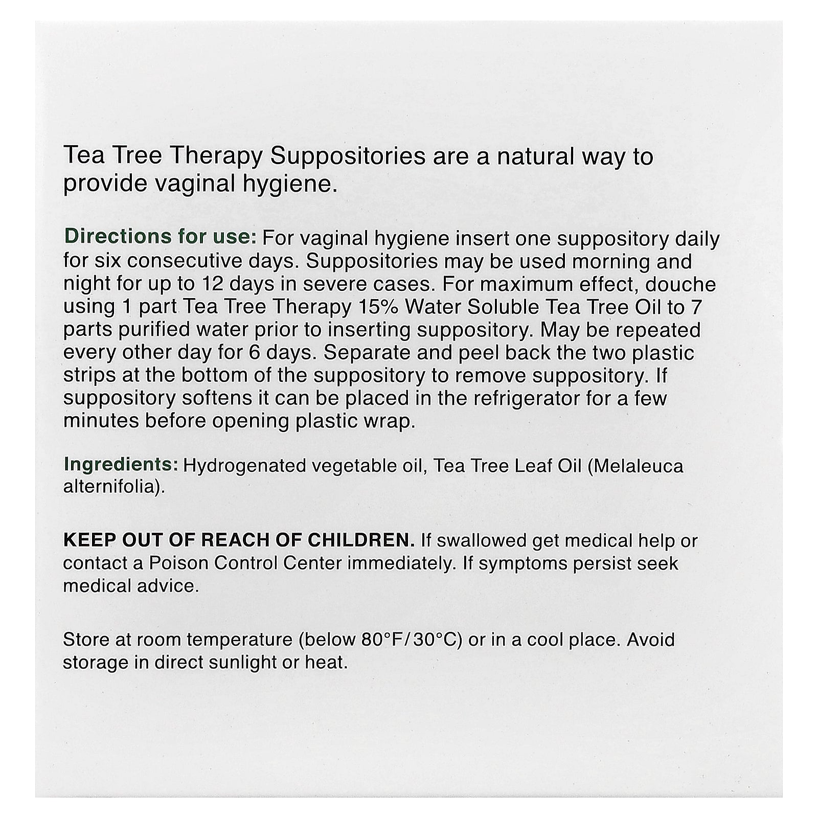 For vaginal hygiene insert one suppository daily for six consecutive days. Suppositories may be used morning and night for up to 12 days in severe cases. For maximum effect, douche using 1 part Tea Tree Therapy 15% Water Soluble Tea Tree Oil to 7 parts purified water prior to inserting suppository. May be repeated every other day for 6 days. Separate and peel back the two plastic strips at the bottom of the suppository to remove suppository. If suppository softens it can be placed in the refrigerator for a few minutes before opening plastic wrap.