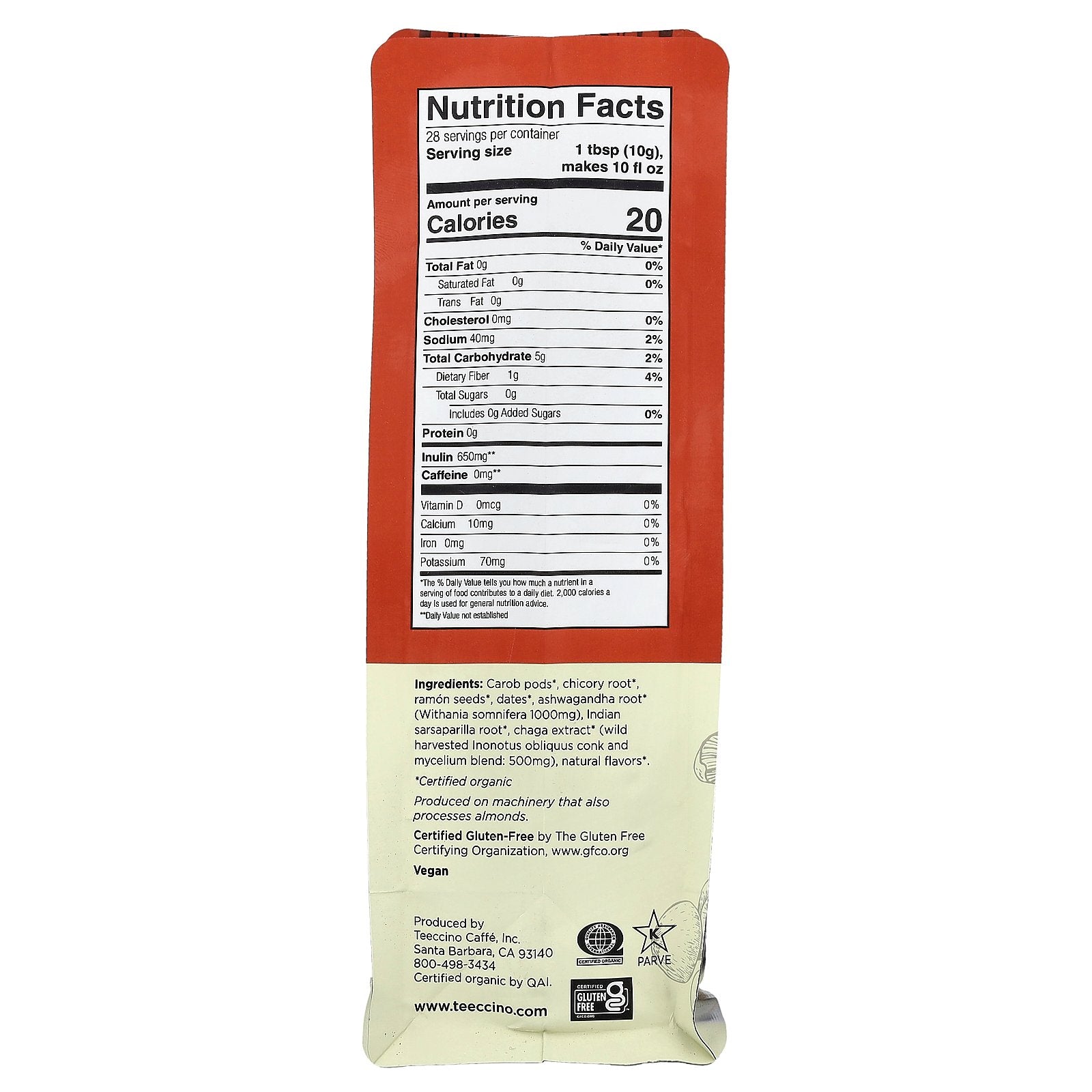 Carob pods*, chicory root*, ramón seeds*, dates*, ashwagandha root* (Withania somnifera 1000 mg), Indian sarsaparilla root*, chaga extract* (wild harvested Inonotus obliquus conk and mycelium blend: 500 mg), natural flavors*.