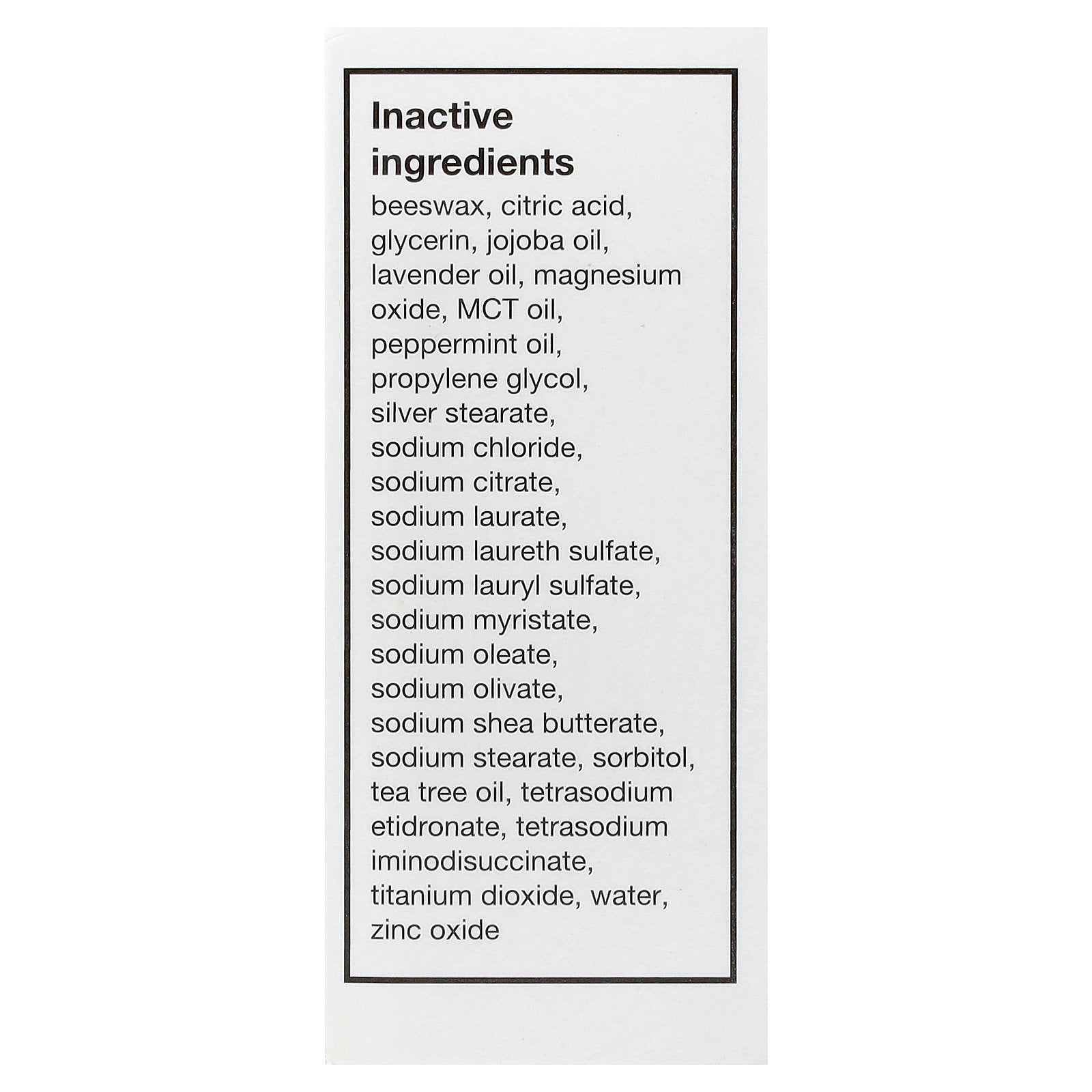 | Inactive Ingredients: Beeswax, citric acid, glycerin, jojoba oil, lavender oil, magnesium oxide, MCT oil, peppermint oil, propylene glycol, silver stearate, sodium chloride, sodium citrate, sodium laurate, sodium laureth sulfate, sodium lauryl sulfate, sodium myristate, sodium oleate, sodium olivate, sodium shea butterate, sodium stearate, sorbitol, tea tree oil, tetrasodium etidronate, tetrasodium iminodisuccinate, titanium dioxide, water, zinc oxide. |