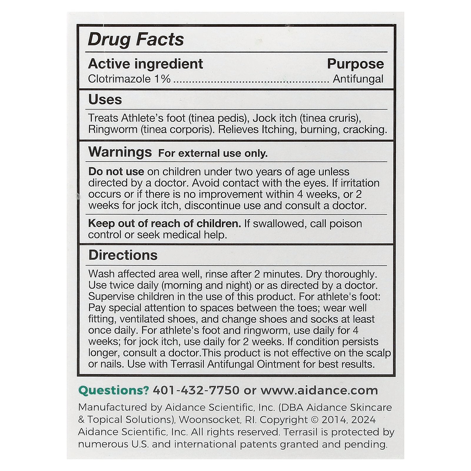 Wash affected area well, rinse after 2 minutes. Dry thoroughly. Use twice daily (morning and night) or as directed by a doctor. Supervise children in the use of this product. For athlete's foot: Pay special attention to spaces between the toes; wear well fitting, ventilated shoes, and change shoes and socks at least once daily. For athlete's foot and ringworm, use daily for 4 weeks; for jock itch, use daily for 2 weeks. If condition persists longer, consult a doctor. This product is not effective on the scalp or nails. Use with Terrasil Antifungal Ointment for best results.