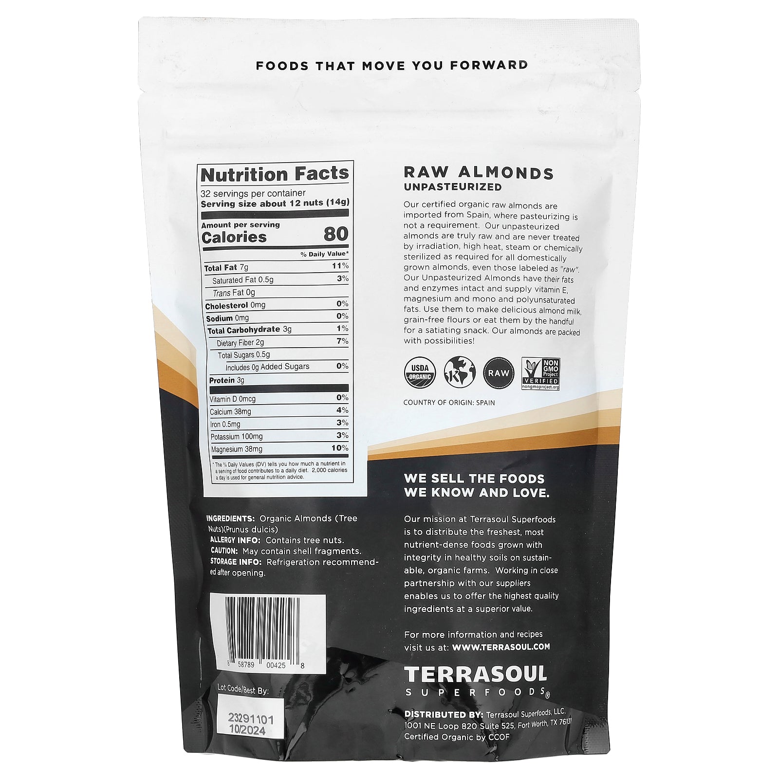 Our certified organic raw almonds are imported from Spain, where pasteurizing is not a requirement. Our unpasteurized almonds are truly raw and are never treated by irradiation, high heat, steam or chemically sterilized as required for all domestically grown almonds, even those labeled as "raw". Our Unpasteurized Almonds have their fats and enzymes intact and supply vitamin E, magnesium and mono and polyunsaturated fats.