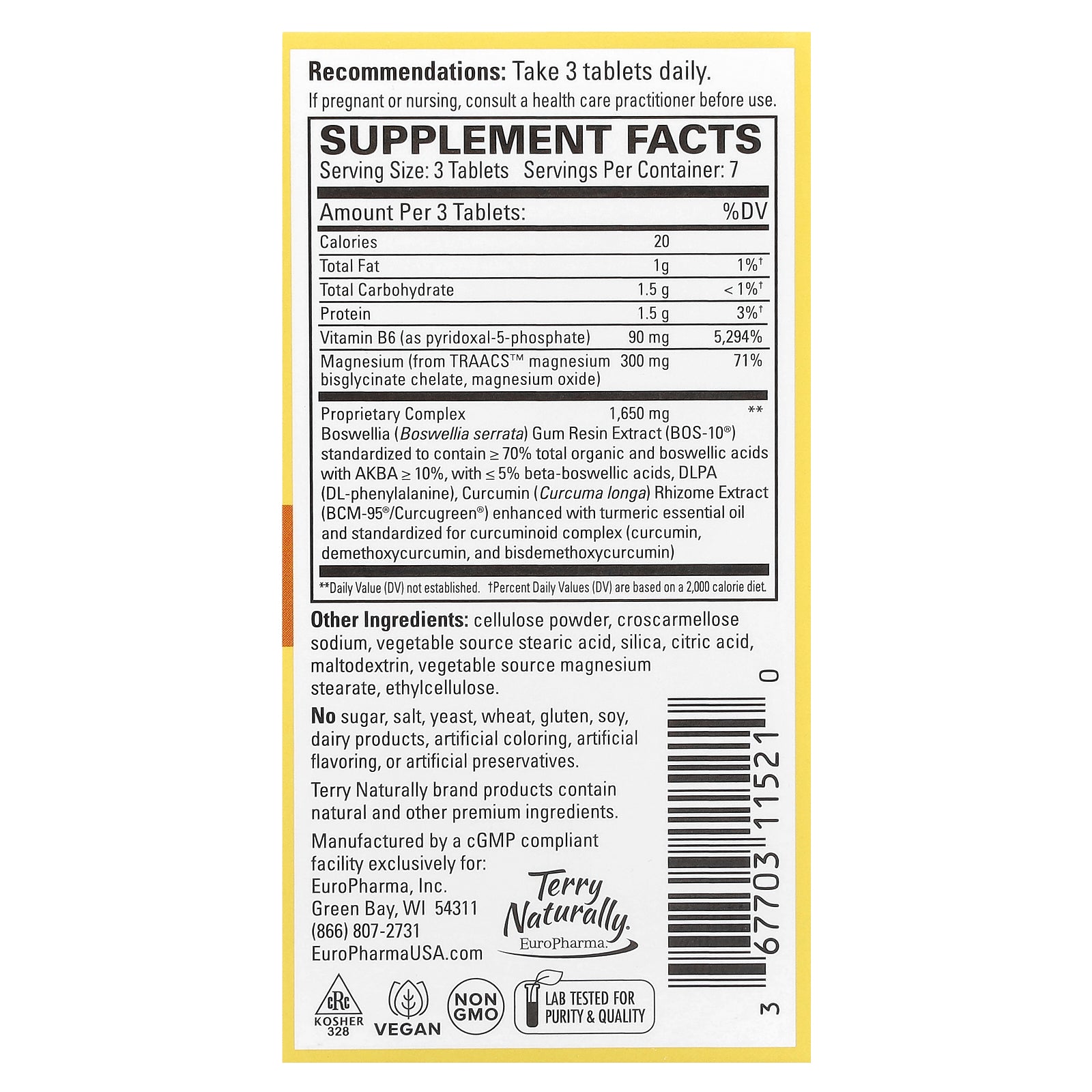 Proprietary Complex Boswellia (Boswellia serrata) Gum Resin Extract (Bos-10®) standardized to contain ≥ 70% Total Organic and Boswellic Acids with AKBA ≥ 10%, with ≤ 5% beta-boswellic acids, DLPA (DL-phenylalanine), Curcumin (Curcuma longa) Rhizome Extract (BCM-95®/Curcugreen®) enhanced with turmeric essential oil and standardized for curcuminoid complex (curcumin, demethoxycurcumin, and bisdemethoxycurcumin) |