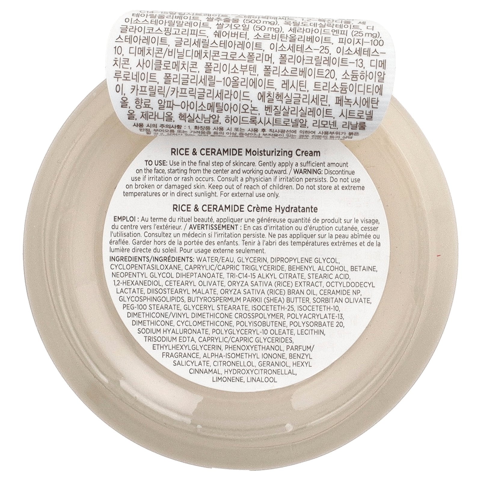 Water/eau, glycerin, dipropylene glycol, cyclopentasiloxane, caprylic/capric triglyceride, behenyl alcohol, betaine, neopentyl glycol diheptanoate, tri-c14-15 alkyl citrate, stearic acid, 1,2-hexanediol, cetearyl olivate, oryza sativa (rice) extract, octyldodecyl lactate, diisostearyl malate, oryza sativa (rice) bran oil, ceramide np, glycosphingolipids, butyrospermum parkii (shea) butter, sorbitan olivate, peg-100 stearate, glyceryl stearate, isoceteth-25, isoceteth-10, dimethicone/vinyl dimethicone crosspolymer, polyacrylate-13, dimethicone, cyclomethicone, polyisobutene, polysorbate 20, sodium hyaluronate, polyglyceryl-10 oleate, lecithin, trisodium edta, caprylic/capric glycerides, ethylhexylglycerin, phenoxyethanol, parfum/ fragrance, alpha-isomethyl ionone, benzyl salicylate, citronellol, geraniol, hexyl cinnamal, hydroxycitronellal, limonene, linalool.