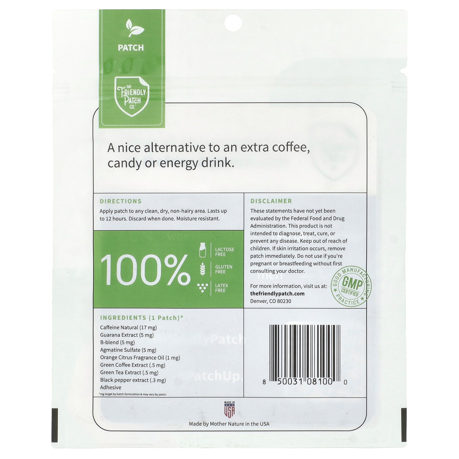 Caffeine natural (17 mg), guarana extract (5 mg), b-blend (5 mg), agmatine sulfate (5 mg), orange citrus fragrance oil (1 mg), green coffee extract (.5 mg), green tea extract (.5 mg), black pepper extract (.3 mg), adhesive.