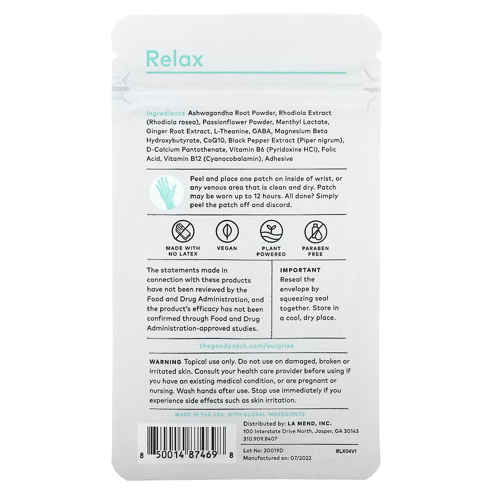 Ashwagandha root powder, rhodiola extract (rhodiola rosea), passionflower powder, menthyl lactate, ginger root extract, l-theanine, gaba, magnesium beta hydroxybutyrate, coq10, black pepper extract (piper nigrum), d-calcium pantothenate, vitamin b6 (pyridoxine hcl), folic acid, vitamin b12 (cyanocobalamin), adhesive.