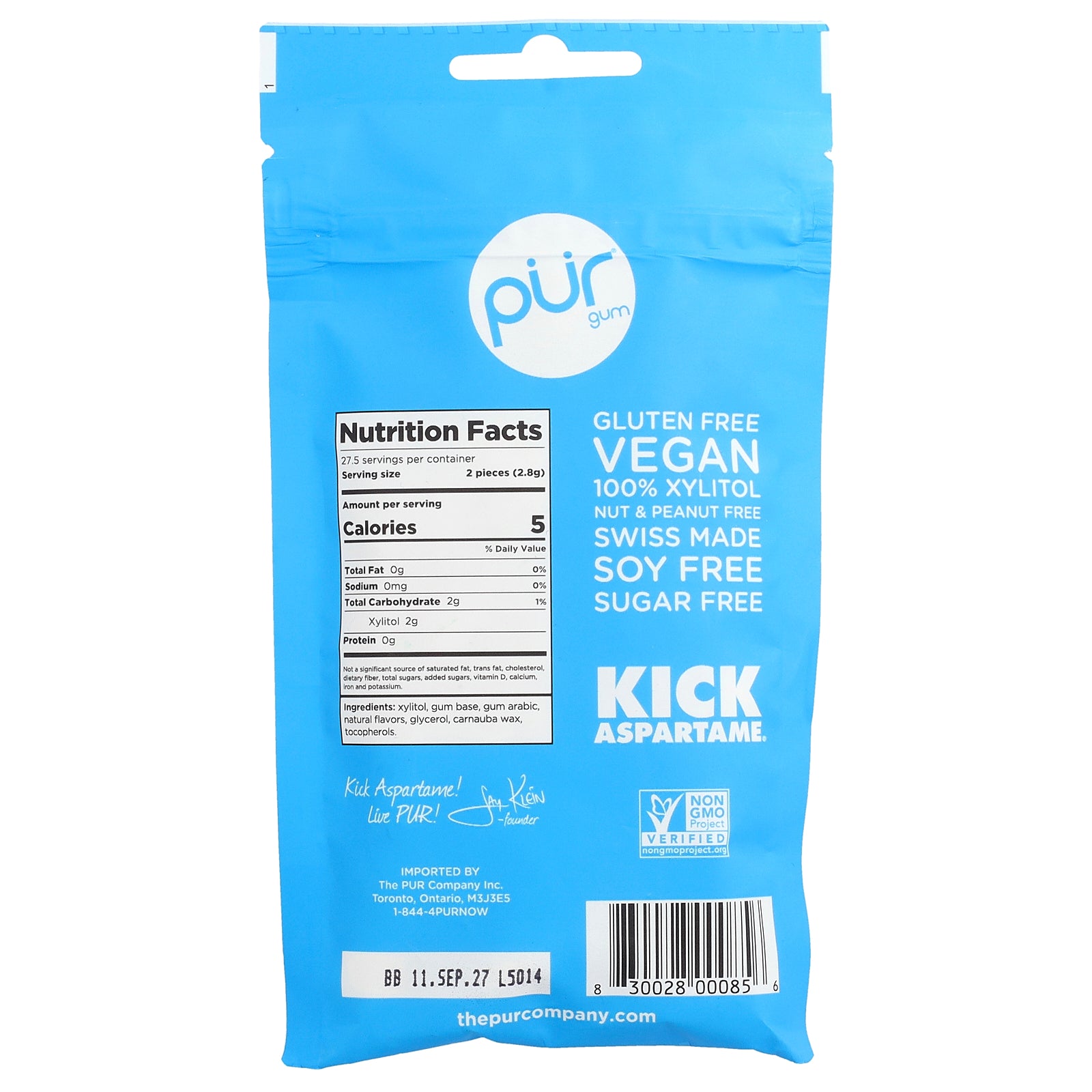 Xylitol, gum base, gum arabic, natural flavors, glycerol, carnauba wax, tocopherols.