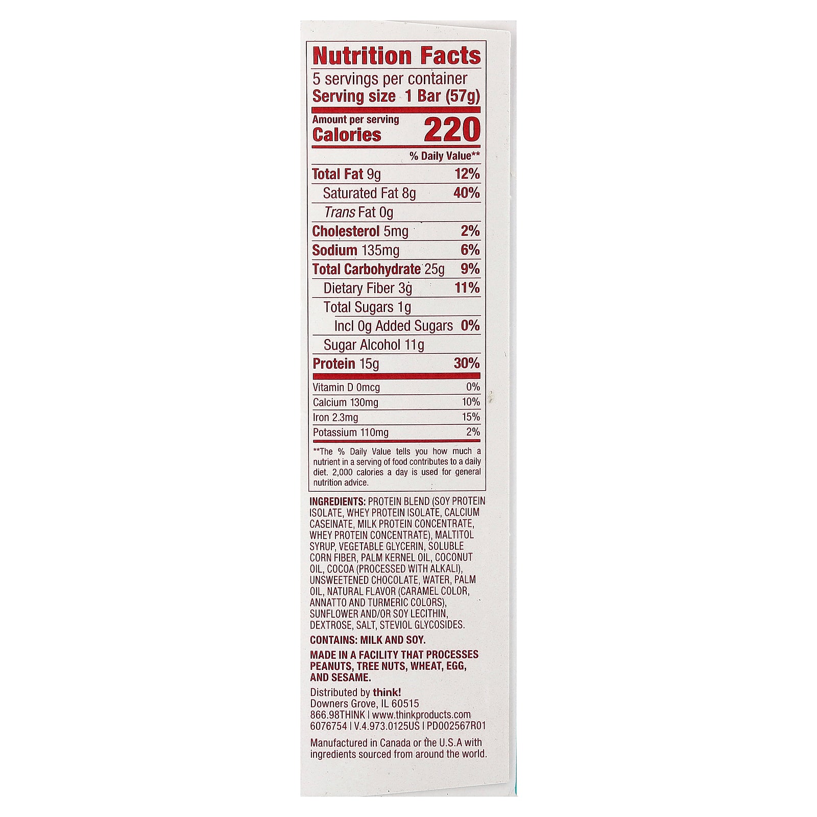 Protein blend (soy protein isolate, whey protein isolate, calcium caseinate, milk protein concentrate, whey protein concentrate), maltitol syrup, vegetable glycerin, soluble corn fiber, palm kernel oil, coconut oil, cocoa (processed with alkali), unsweetened chocolate, water, palm oil, natural flavor (caramel color, annatto and turmeric colors) sunflower and/or soy lecithin, dextrose, salt, steviol glycosides.