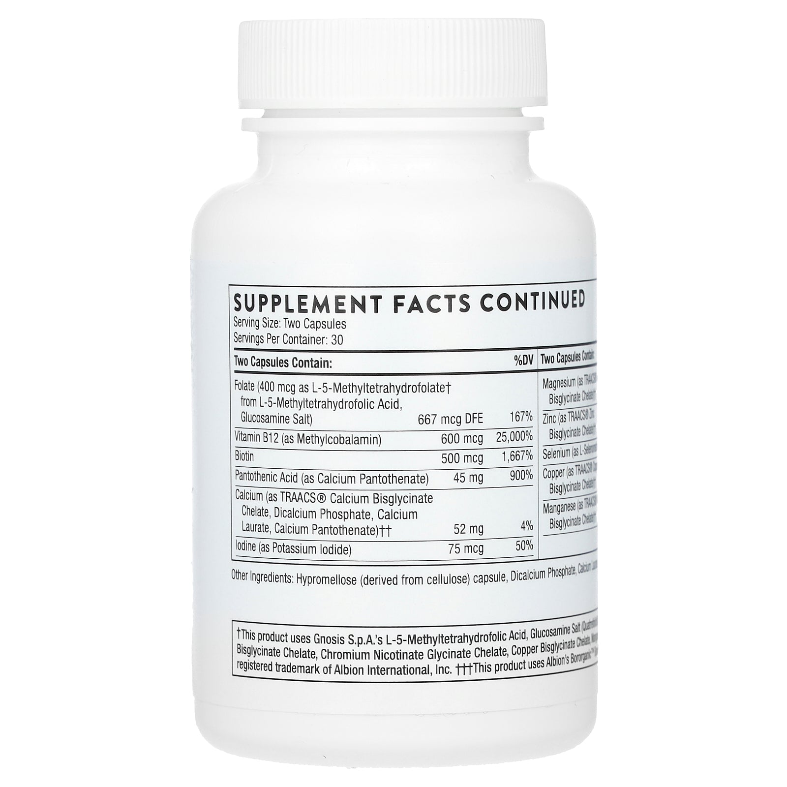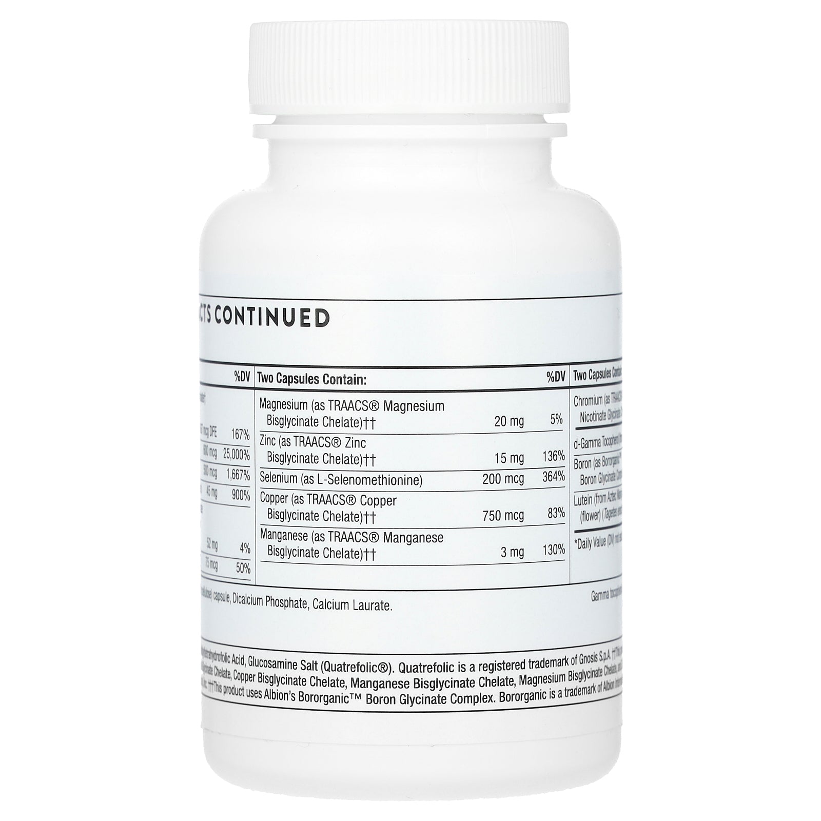 | *Daily Value (DV) not established. †This product uses Gnosis S.p.A.'s L-5-Methyltetrahydrofolic Acid, Glucosamine Salt (Quatrefolic®). ††This product uses Albion's TRAACS® Calcium Bisglycinate Chelate, Chromium Nicotinate Glycinate Chelate, Copper Bisglycinate Chelate, Manganese Bisglycinate Chelate, Magnesium Bisglycinate Chelate, and Zinc Bisglycinate Chelate. †††This product uses Albion's Bororganic Boron™ Glycinate Complex. Gamma tocopherol does not have a recognized IU equivalent. | ||