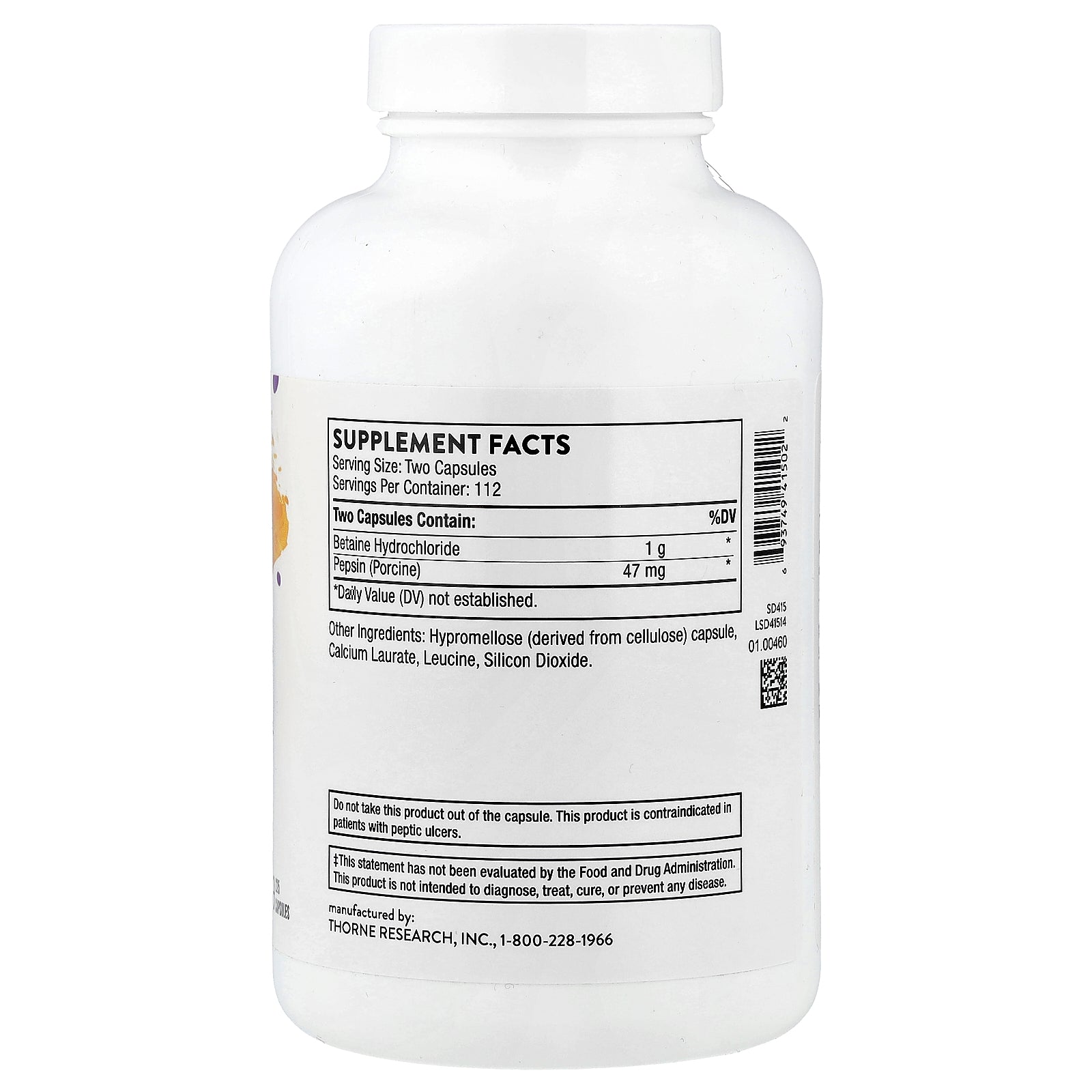 Indigestion can be caused by many things – including inadequate amounts of hydrochloric acid (HCl) in the stomach. HCl secretion in the stomach does several positive things. It assists protein digestion by activating pepsinogen to pepsin, it renders the stomach sterile against ingested pathogens, it inhibits undesirable overgrowth in the small intestine, and it encourages the flow of bile and pancreatic enzymes. Hydrochloric acid also facilitates the absorption of a number of nutrients, including folate, vitamin B12, ascorbic acid, beta-carotene, iron, and some forms of calcium, magnesium, and zinc. Numerous studies have shown that hydrochloric acid secretion in the stomach begins to decline with advancing age. Overuse of antacids or acid blockers can also lead to low levels of hydrochloric acid in the stomach, which can result in poor protein digestion. Thorne's Betaine HCl & Pepsin comes from a porcine source.