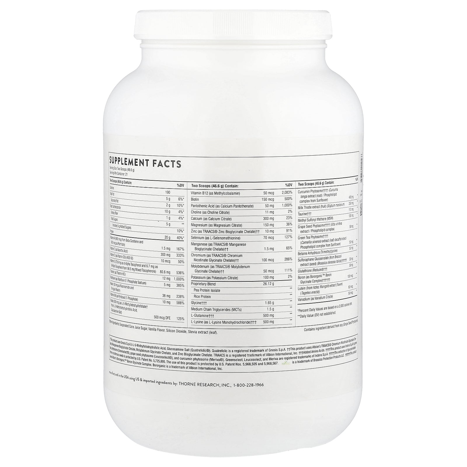 | * Percent Daily Values are based on a 2,000 calorie diet. **Daily Value (DV) not established. † This product uses Gnosis S.p.A.'s L-5-Methyltetrahydrofolic Acid, Glucosamine Salt (Quatrefolic®). †† This product uses Albion's TRAACS® Chromium Nicotinate Glycinate Chelate, Manganese Bisglycinate Chelate, Molybdenum Glycinate Chelate, and Zinc Bisglycinate Chelate. ††† VegaLite, Thorne's trade name for proprietary pea / rice protein blend. †††† Added Amino Acids. †††††This product uses Indena S.p.A.'s greentea phytosome (Greenselect®), grape seed phytosome (Leucoselect®), and curcumin phytosome (Meriva®). †††††† The extraction of glucosinolates from cruciferous seeds is protected by U.S Patent No. 5,725,895. The use of this product is protected by U.S. Patent Nos. 5,968,505 and 5,968,567. ††††††† This product uses Albion's Bororganic™ Boron Glycinate Complex. | ||