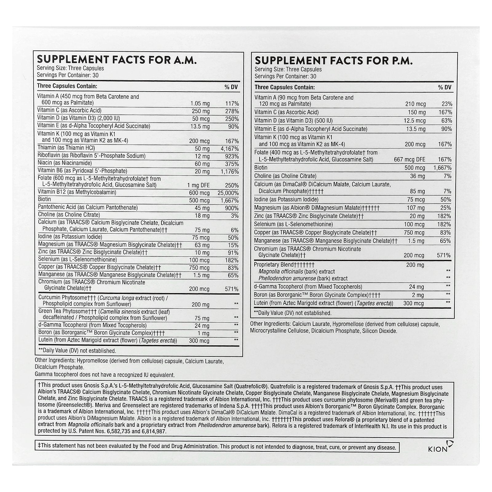 | **Daily Value (DV) not established. †This product uses Gnosis S.p.A.'s L-5-Methyltetrahydrofolic Acid, Glucosamine Salt (Quatrefolic®). ††This product uses Albion's TRAACS® Calcium Bisglycinate Chelate, Chromium Nicotinate Glycinate Chelate, Copper Bisglycinate Chelate, Manganese Bisglycinate Chelate, Magnesium Bisglycinate Chelate, and Zinc Bisglycinate Chelate. †††This product uses curcumin phytosome (Meriva®) and green tea phytosome (Greenselect®). ††††This product uses Albion's Bororganic™ Boron Glycinate Complex. †††††This product uses Albion's DimaCal® DiCalcium Malate. ††††††This product uses Albion's DiMagnesium Malate. †††††††This product uses Relora® (a proprietary blend of a patented extract from Magnolia officinalis bark and a proprietary extract from Phellodendron amurense bark). | ||