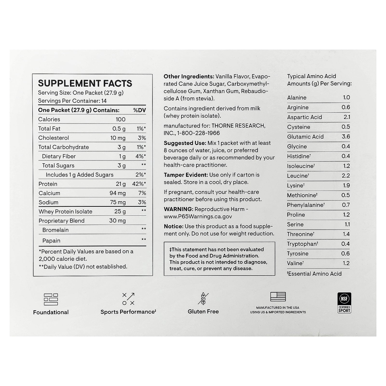 Thorne's Whey Protein Isolate delivers 21 g of bioavailable protein and all 9 essential amino acids. With only 100 calories, 3 g sugar, and a delicious vanilla flavor, Thorne's Whey Protein Isolate mixes quickly into water for a fast shake to curb afternoon cravings. Blend it into your favorite fresh-fruit smoothie or stir it into overnight oatmeal for a low-fat, protein-rich breakfast.