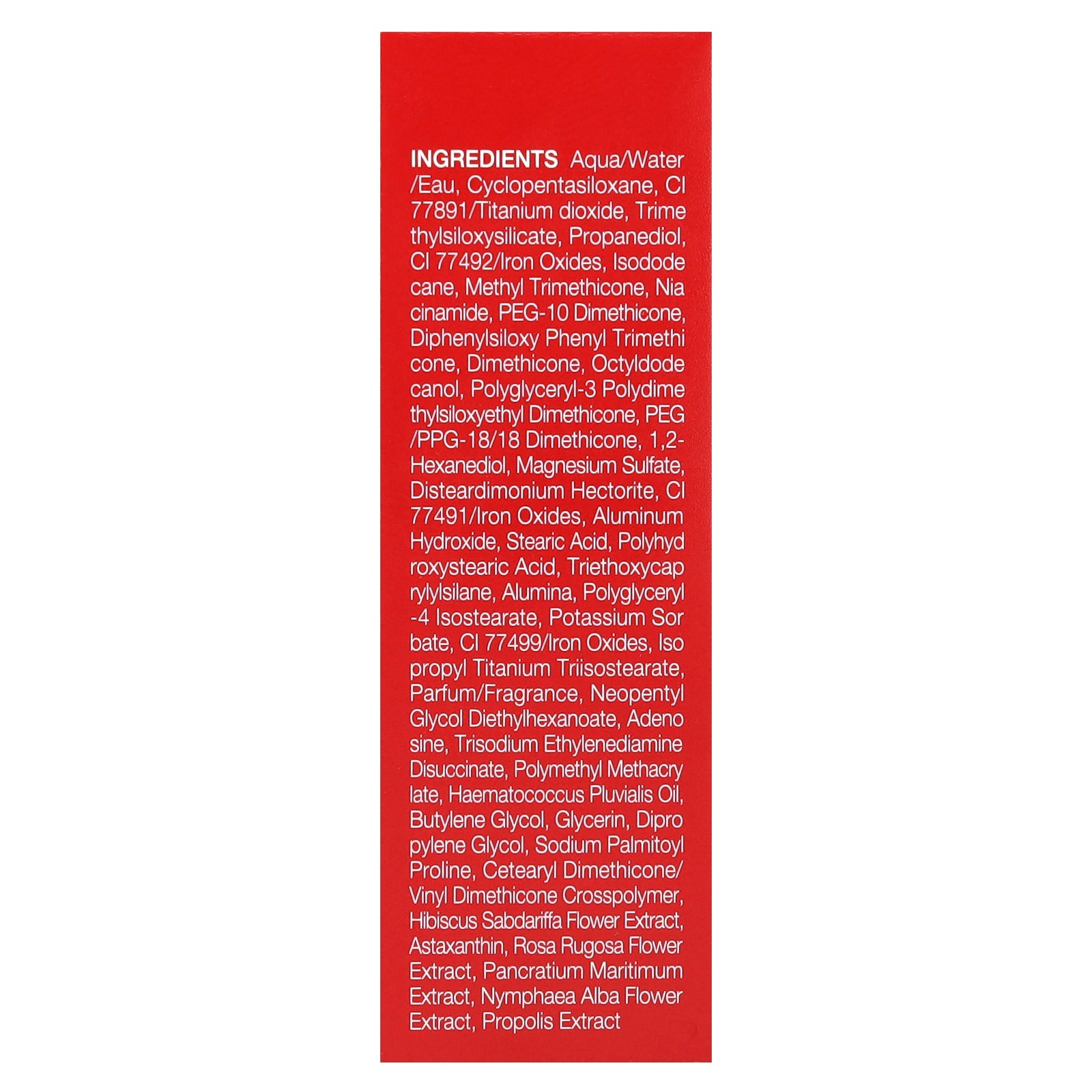 Aqua/water/eau, cyclopentasiloxane, ci 77891/titanium dioxide, trimethylsiloxysilicate, propanediol, ci 77492/iron oxides, isododecane, methyl trimethicone, niacinamide, peg-10 dimethicone, diphenylsiloxy phenyl trimethicone, dimethicone, octyldodecanol, polyglyceryl-3 polydime thylsiloxyethyl dimethicone, peg /ppg-18/18 dimethicone, 1,2- hexanediol, magnesium sulfate, disteardimonium hectorite, ci 77491/iron oxides, aluminum hydroxide, stearic acid, polyhydroxystearic acid, triethoxycaprylylsilane, alumina, polyglyceryl -4 isostearate, potassium sorbate, ci 77499/iron oxides, isopropyl titanium triisostearate, parfum/fragrance, neopentylglycol diethylhexanoate, adenosine, trisodium ethylenediamine disuccinate, polymethyl methacrylate, haematococcus pluvialis oil, butylene glycol, glycerin, dipropylene glycol, sodium palmitoyl proline, cetearyl dimethicone/ vinyl dimethicone crosspolymer, hibiscus sabdariffa flower extract, astaxanthin, rosa rugosa flower extract, pancratium maritimum extract, nymphaea alba flower extract, propolis extract.