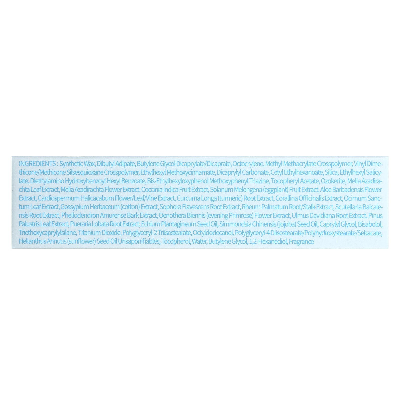 Synthetic wax, dibutyl adipate, butylene glycol dicaprylate/dicaprate, octocrylene, methyl methacrylate crosspolymer, vinyl dimethicone/methicone silsesquioxane crosspolymer, ethylhexyl methoxycinnamate, dicaprylyl carbonate, cetyl ethylhexanoate, silica, ethylhexyl salicylate, diethylamino hydroxybenzoyl hexyl benzoate, bis-ethylhexyloxyphenol methoxyphenyl triazine, tocopheryl acetate, ozokerite, melia azadirachta leaf extract, melia azadirachta flower extract, coccinia indica fruit extract, solanum melongena (eggplant) fruit extract, aloe barbadensis flower extract, cardiospermum halicacabum flower/leaf/vine extract, curcuma longa (turmeric) root extract, corallina officinalis extract, ocimum sanctum leaf extract, gossypium herbaceum (cotton) extract, sophora flavescens root extract, rheum palmatum root/stalk extract, scutellaria baicalensis root extract, phellodendron amurense bark extract, oenothera biennis (evening primrose) flower extract, ulmus davidiana root extract, pinus palustris leaf extract, pueraria lobata root extract, echium plantagineum seed oil, simmondsia chinensis (jojoba) seed oil, caprylyl glycol, bisabolol, triethoxycaprylylsilane, titanium dioxide, polyglyceryl-2 triisostearate, octyldodecanol, polyglyceryl-4 diisostearate/polyhydroxystearate/sebacate, helianthus annuus (sunflower) seed oil unsaponifiables, tocopherol, water, butylene glycol, 1,2-hexanediol, fragrance.