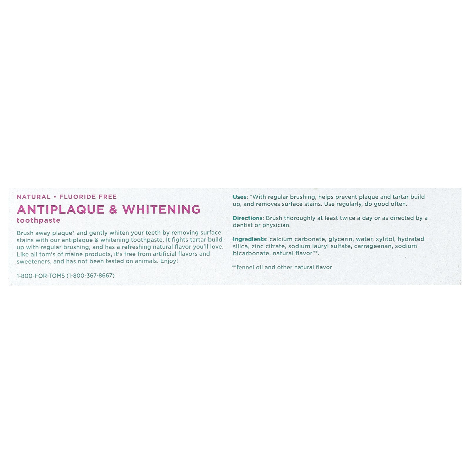 Brush away plaque* and gently whiten your teeth by removing surface stains with our antiplaque & whitening toothpaste. It fights tartar build up with regular brushing, and has a refreshing natural flavor you'll love. Like all tom's of Maine products, it's free from artificial flavors and sweeteners, and has not been tested on animals. Enjoy!
