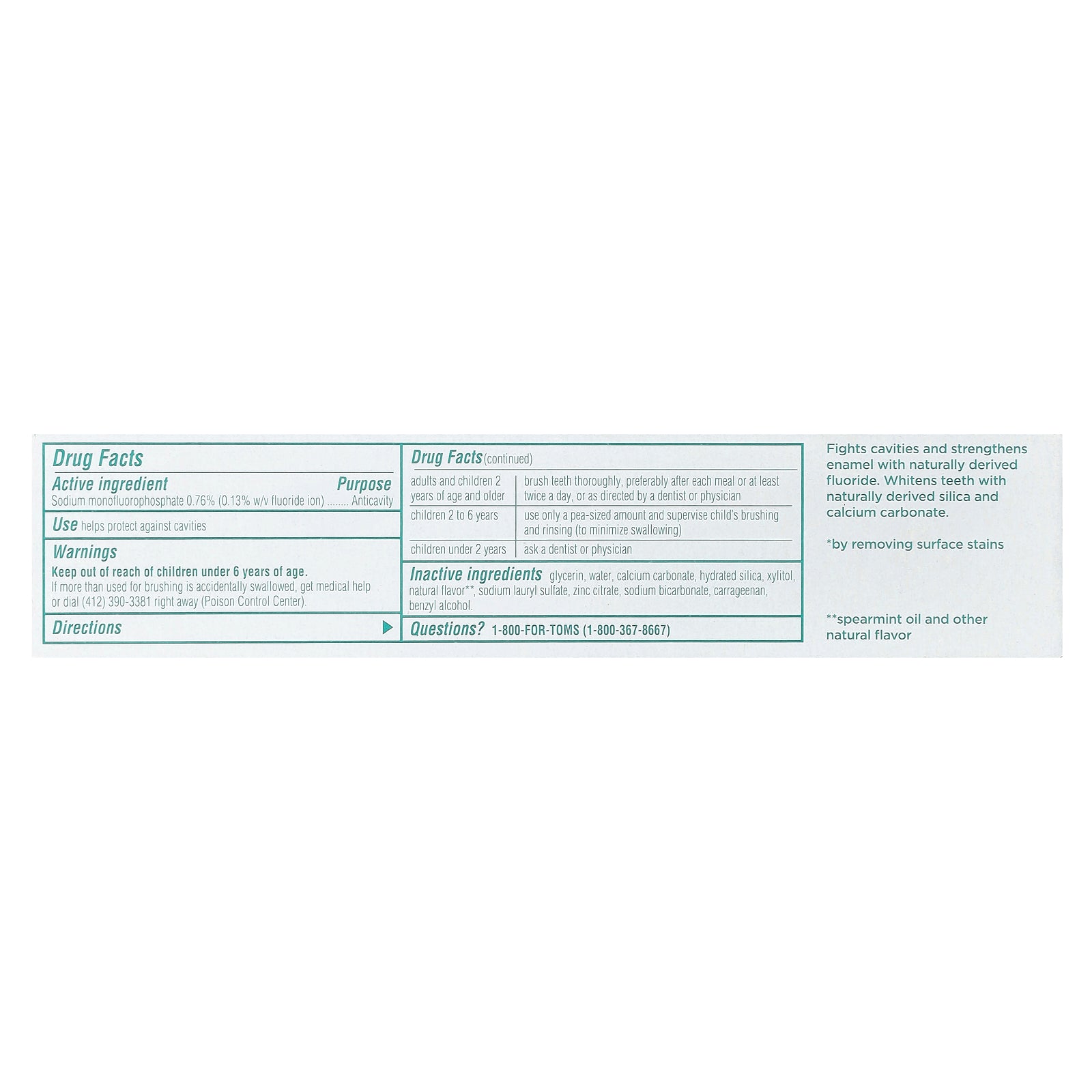 Fights cavities and strengthens enamel with naturally derived fluoride. Whitens teeth with naturally derived silica and calcium carbonate.