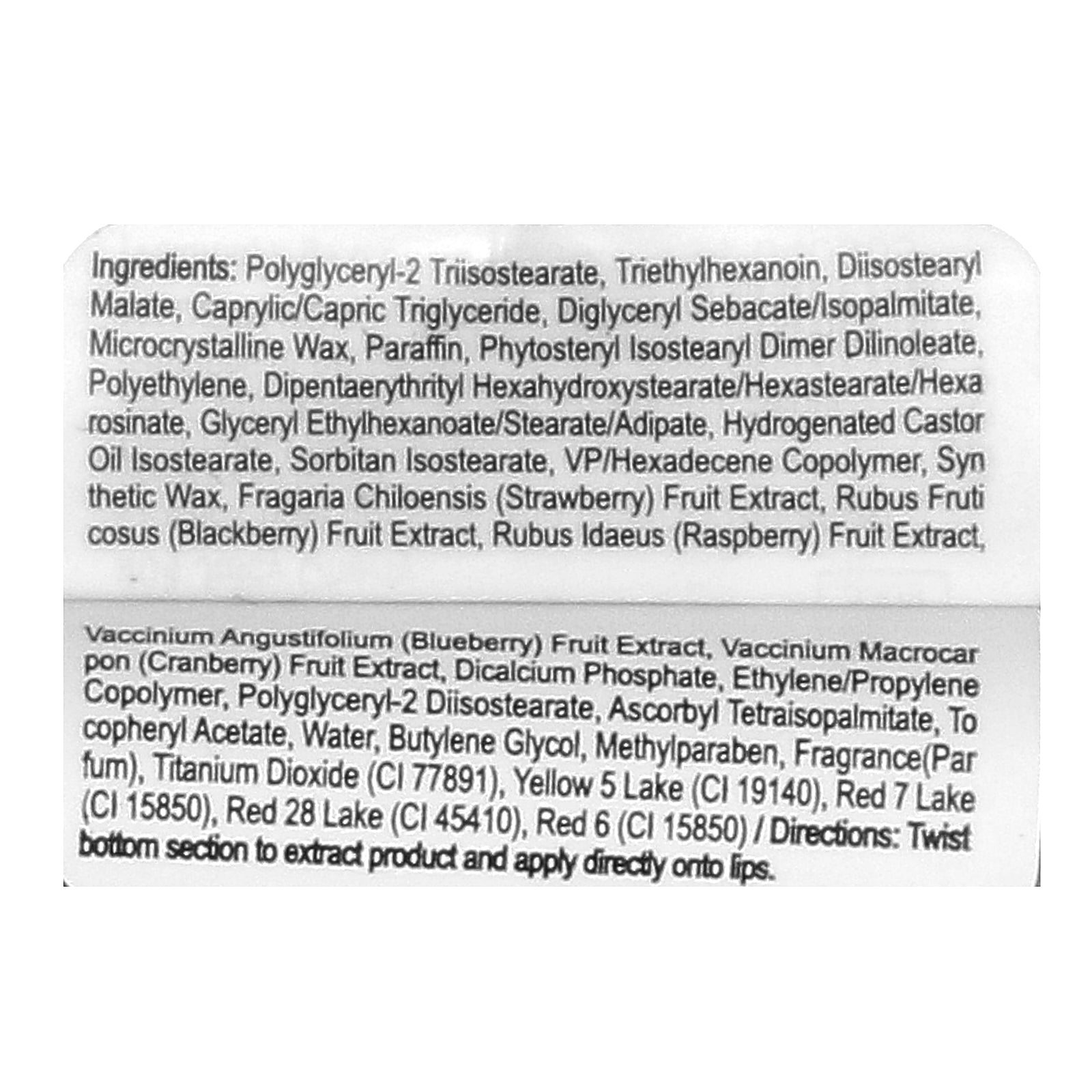 Polyglyceryl-2, triisostearate, triethylhexanoin, diisostearyl isostearyl malate, caprylic/capric triglycerides, glyceryl sebacate d / isopalmitate, ozokerite, ceresin, phytostearyl isostearyl dimer dilinoleate, polyethylene, glyceryl ethylhexanoate/stearate/adipate, dipentaerythrityl, hexahydroxystearate/hexastearate, vp/hexadecene copolymer, titanium dioxide (ci 77891), hydrogenated castor oil isostearate, synthetic wax, wild berry extract, cranberry fruit extract, strawberry extract, raspberry extract, blueberry extract, blackberry extract, tocopheryl acetate, calcium d phosphate, sorbitan isostearate, ethylene/propylene copolymer, polyglyceryl-2 diisostearate, ascorbyl palmitate, purified water, butylene glycol, methyl paraben, phenoxyethanol, butylparaben, butylparaben, ethyl paraben, isobutyl paraben, fragrance, food red no.202 (ci 15850:1), food red no.201 (ci 15850), magnesium violet (ci 77742).Suggested Use