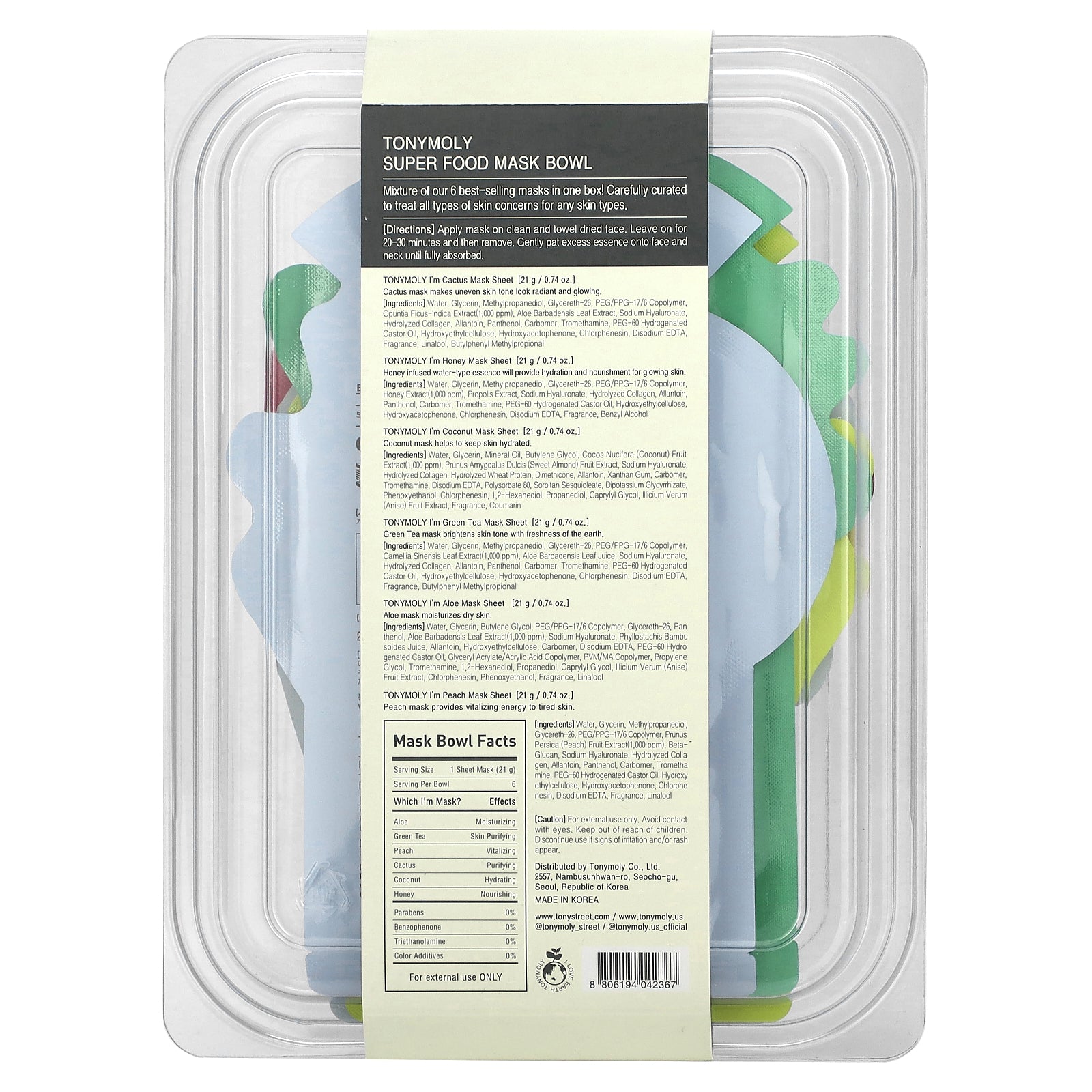 I'm cactus mask sheet: Water, glycerin, methylpropanediol, glycereth-25 peg/ppg-17/6 copolymer, opuntia ficus-indica extract1,000 ppm), aloe barbadensis leaf extract, sodium hyaluronate, hydrolyzed collagen, allantoin, panthenol, carbomer, tromethamine, peg-40 hydrogenated castor oil, hydroxyethylcellulose, hydroxyacetophenone, chlorphenesin, disodium edta fragrance, linalool, butylphenyl methylpropional