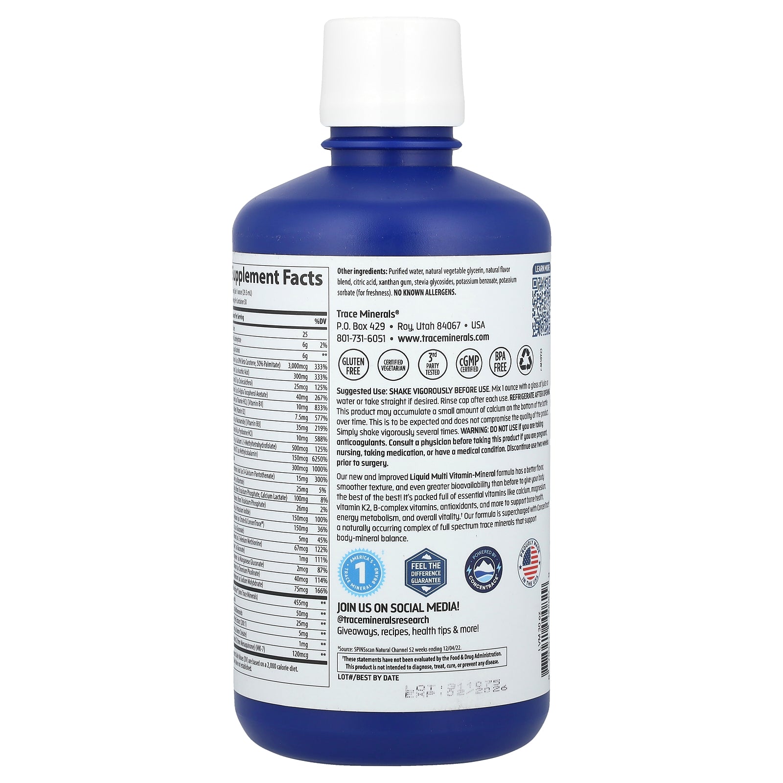 Our new and improved Liquid Multi Vitamin-Mineral formula has a better flavor, smoother texture, and even greater bioavailability than before to give your body the best of the best! It's packed full of essential vitamins like calcium, magnesium, Vitamin K2, B-complex vitamins, antioxidants, and more to support bone health, energy metabolism, and overall vitality. Our formula is supercharged with ConcenTrace®, a naturally occurring complex of full spectrum trace minerals that support body-mineral balance.