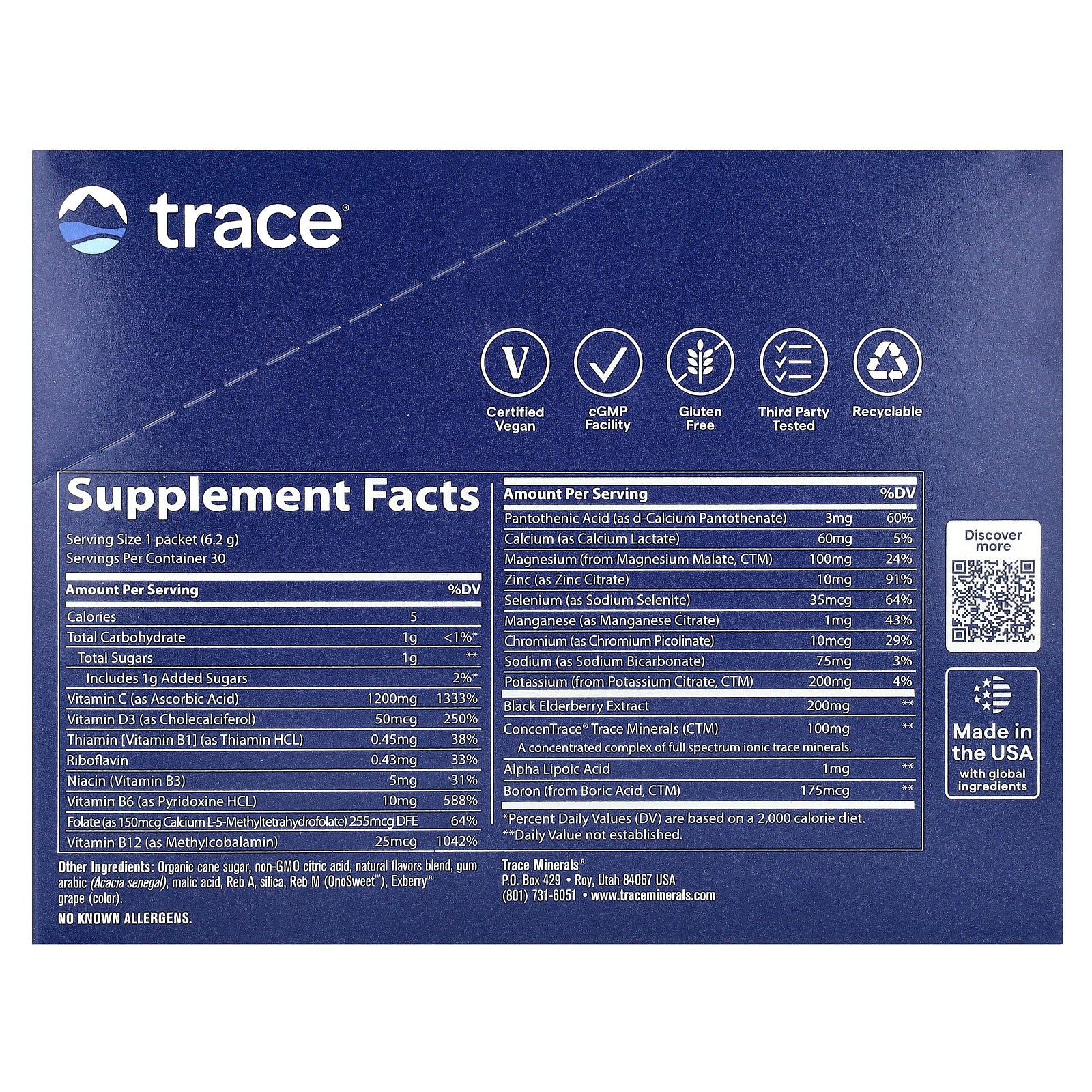 Trace Minerals Power Paks contain a category-leading 1,200 mg of vitamin C along with B vitamins, essential electrolytes such as sodium, potassium, magnesium, and calcium, and no artificial flavors, colors, or sweeteners. We've also added ConcenTrace® a full-spectrum complex of ionic trace minerals - to support body-mineral balance.