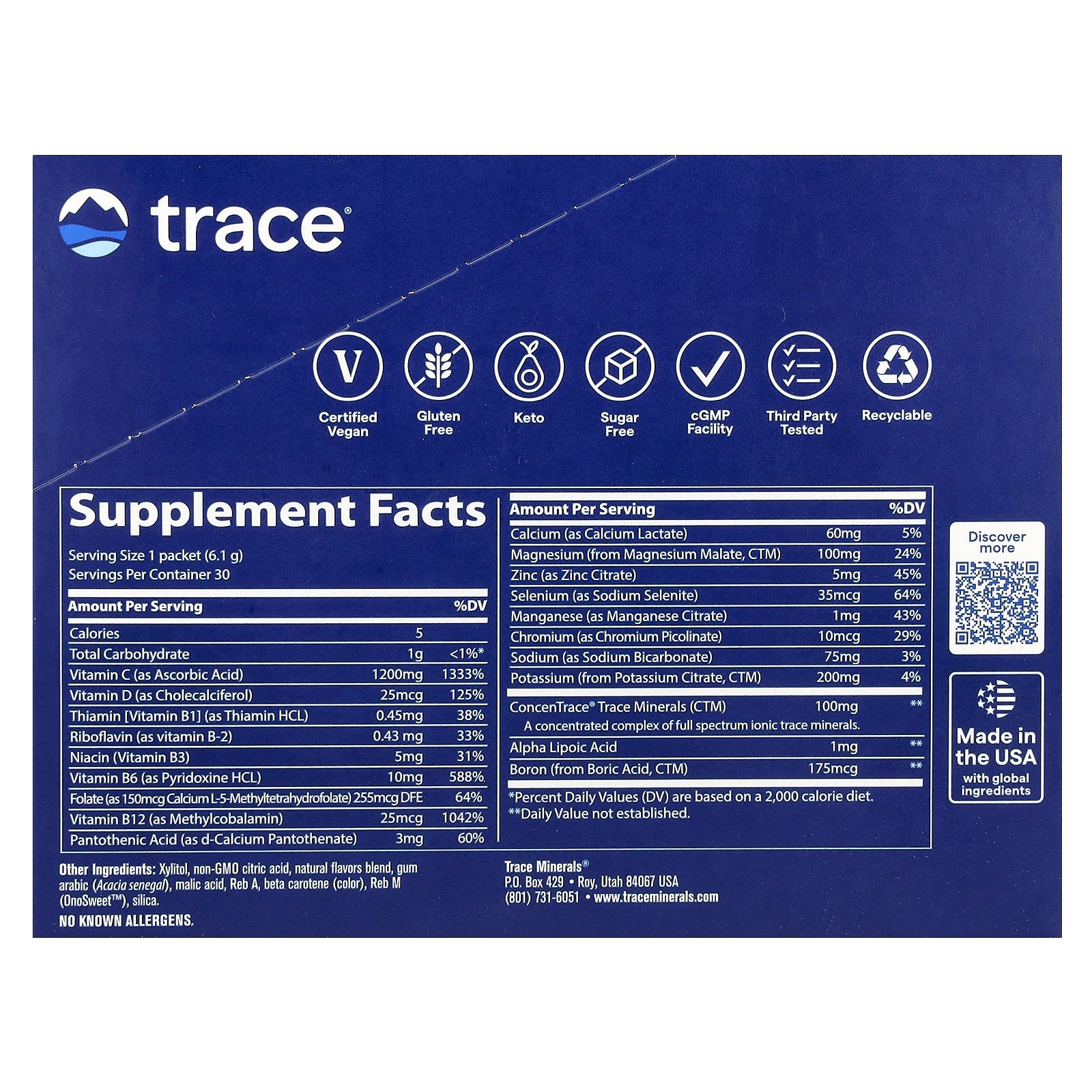 Trace Minerals Power Paks contain a category-leading 1,200 mg of vitamin C along with B vitamins, essential electrolytes such as sodium, potassium, magnesium, and calcium, and no artificial flavors, colors, or sweeteners. We've also added ConcenTrace® - a full-spectrum complex of ionic trace minerals - to support body-mineral balance.