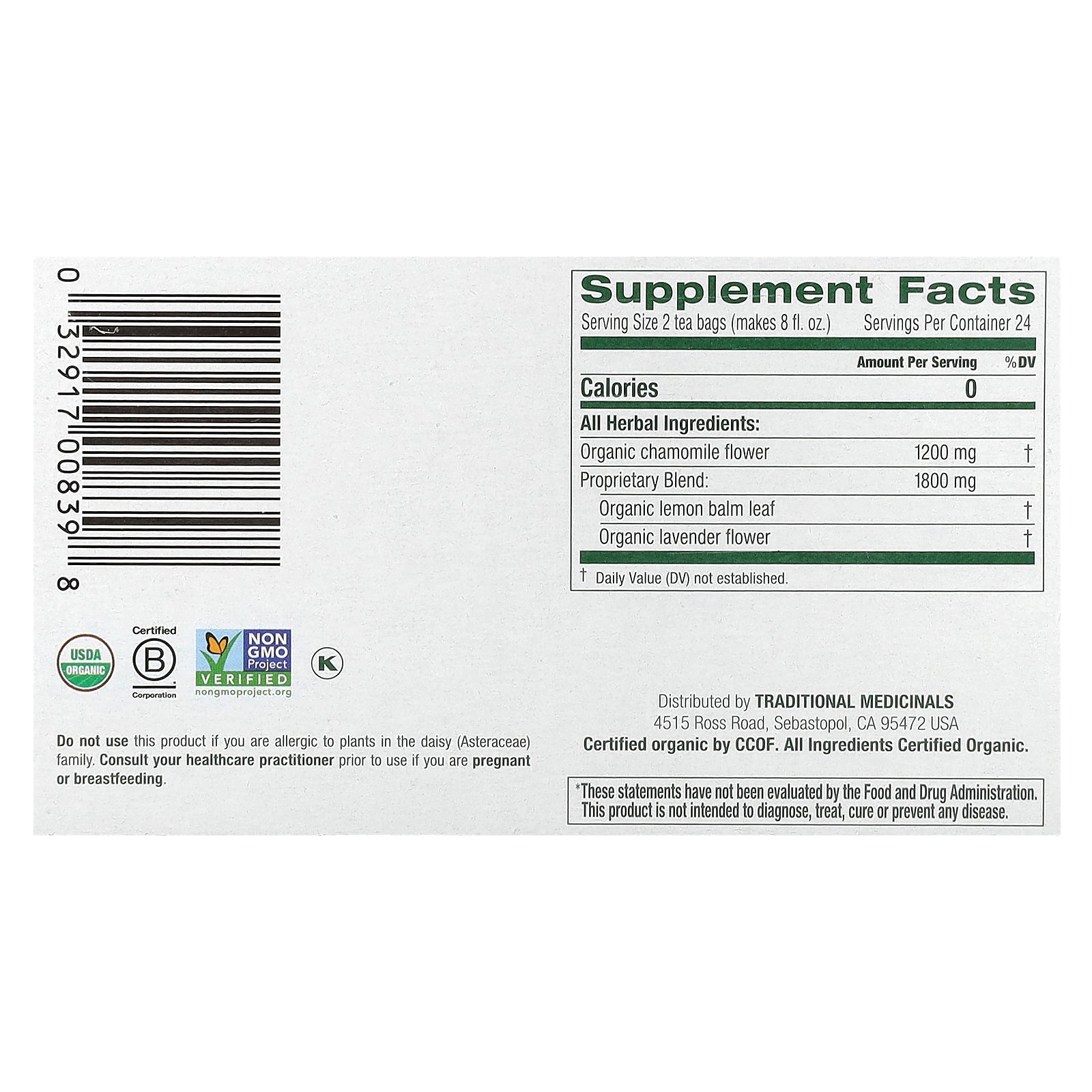 | Serving Size: 2 tea bags (makes 8 fl. oz.) | ||