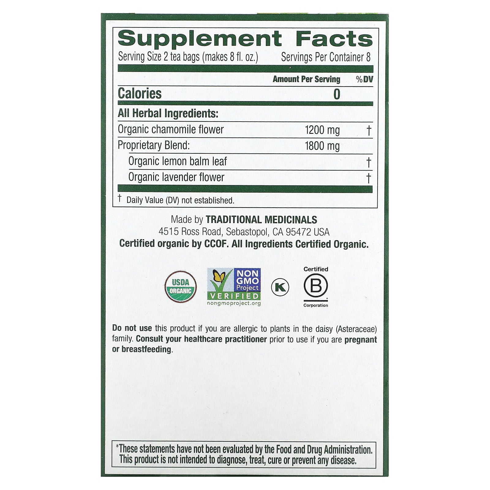 | Serving Size: 2 tea bags (makes 8 fl oz) | ||