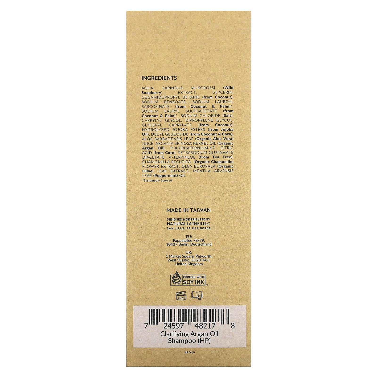 Aqua, sapindus mukorossi (wild soapberry) extract, glycerin, cocamidopropyl betaine (from coconut) sodium benzoate, sodium lauroyl sarcosinate (from coconut & palm)*, sodium lauryl sulfoacetate (from coconut & palm) *, sodium chloride (salt), caprylyl glycol, dipropylene glycol, glyceryl caprylate (from coconut), hydrolyzed jojoba esters (from jojoba oil), decyl glucoside (from coconut & corn), aloe barbadensis leaf (organic aloe vera) juice, argania spinosa kernel oil (organic argan oil), polyquaternium-67, citric acid (from corn), tetrasodium glutamate diacetate, 4-terpineol (from tea tree), chamomilla recutita (organic chamomile) flower extract, olea europaea (organic olive) leaf extract, mentha arvensis leaf (peppermint) oil .