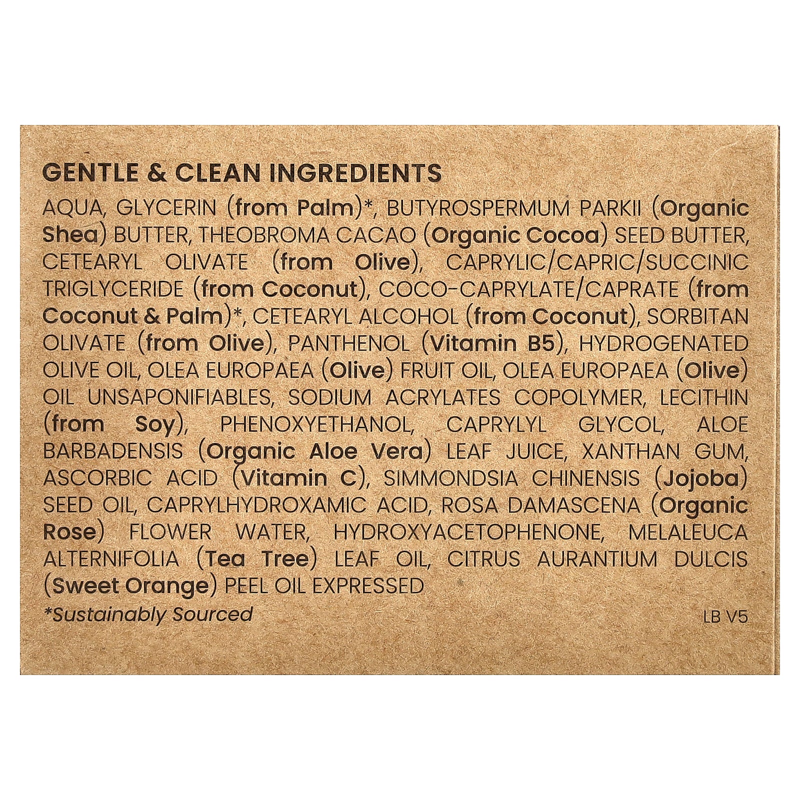 Aqua, glycerin (from palm)*, butyrospermum parkii (organic shea) butter, theobroma cacao (organic cocoa) seed butter, cetearyl olivate (from olive), caprylic/capric/succinic triglyceride (from coconut), coco-caprylate/caprate (from coconut & palm)*, cetearyl alcohol (from coconut), sorbitan olivate (from olive), panthenol (vitamin b5), hydrogenated olive oil, olea europaea (olive) fruit oil, olea europaea (olive) oil unsaponifiables, sodium acrylates copolymer, lecithin (from soy ), phenoxyethanol, caprylyl glycol, aloe barbadensis (organic aloe vera) leaf juice, xanthan gum, ascorbic acid (vitamin c), simmondsia chinensis (jojoba) seed oil, caprylhydroxamic acid, rosa damascena (organic rose flower water, hydroxyacetophenone, melaleuca alternifolia (tea tree) leaf oil, citrus aurantium dulcis (sweet orange) peel oil expressed.