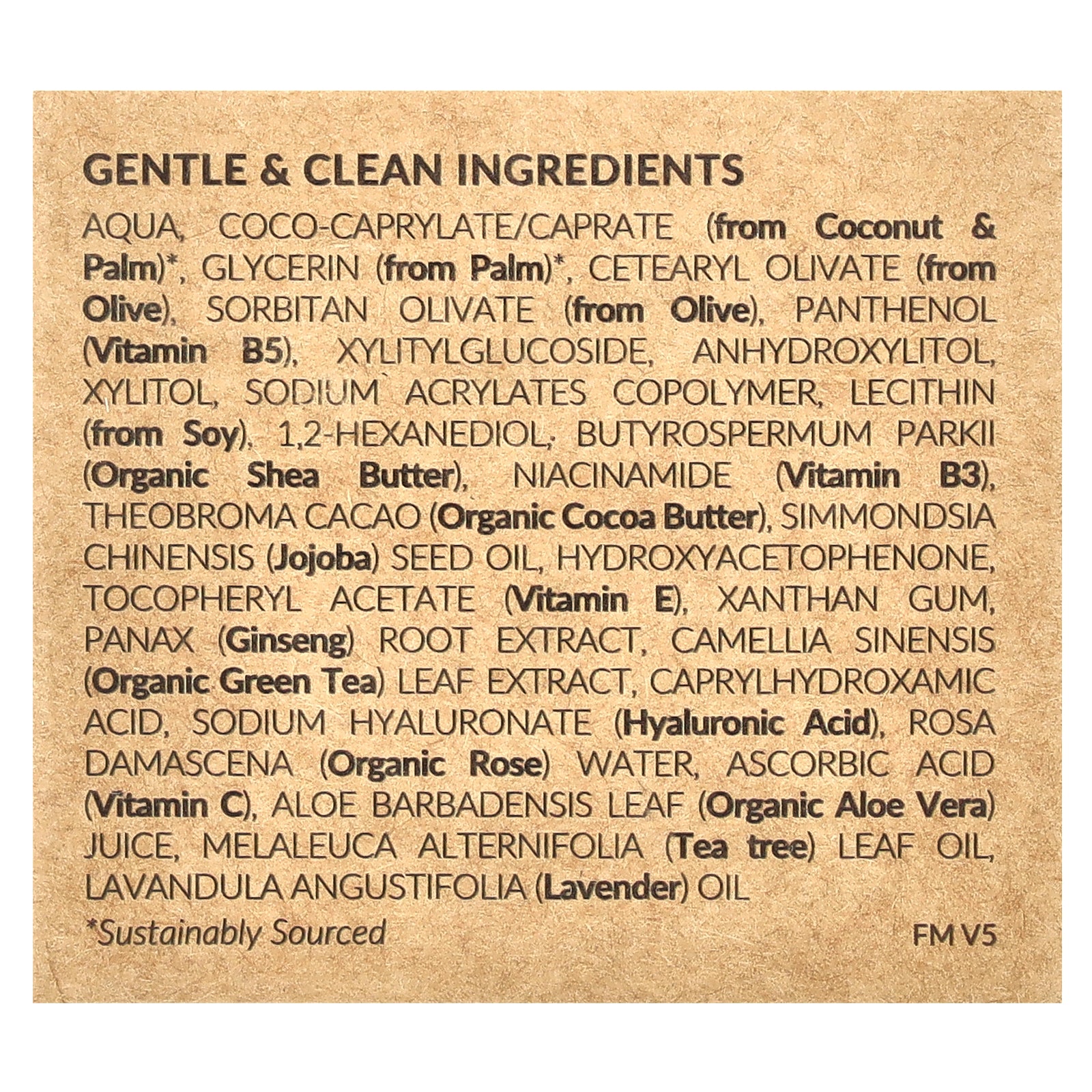 Aqua, coco-caprylate/caprate (from coconut palm)*, glycerin (from palm)*, cetearyl olivate (from olive), sorbitan olivate (from olive), panthenol (vitamin b5), xylitylglucoside, anhydroxylitol, xylitol, sodium acrylates copolymer, lecithin (from soy), 1,2-hexanediol, butyrospermum parkii (organic shea butter), niacinamide (vitamin b3), theobroma cacao (organic cocoa butter), simmondsia chinensis (jojoba) seed oil, hydroxyacetophenone tocopheryl acetate (vitamin e), xanthan gum, panax (ginseng) root extract, camellia sinensis (organic green tea) leaf extract, caprylhydroxamic acid, sodium hyaluronate (hyaluronic acid), rosa damascena (organic rose) water, ascorbic acid (vitamin c), aloe barbadensis leaf (organic aloe vera) juice, melaleuca alternifolia (tea tree) leaf oil, lavandula angustifolia (lavender) oil.
