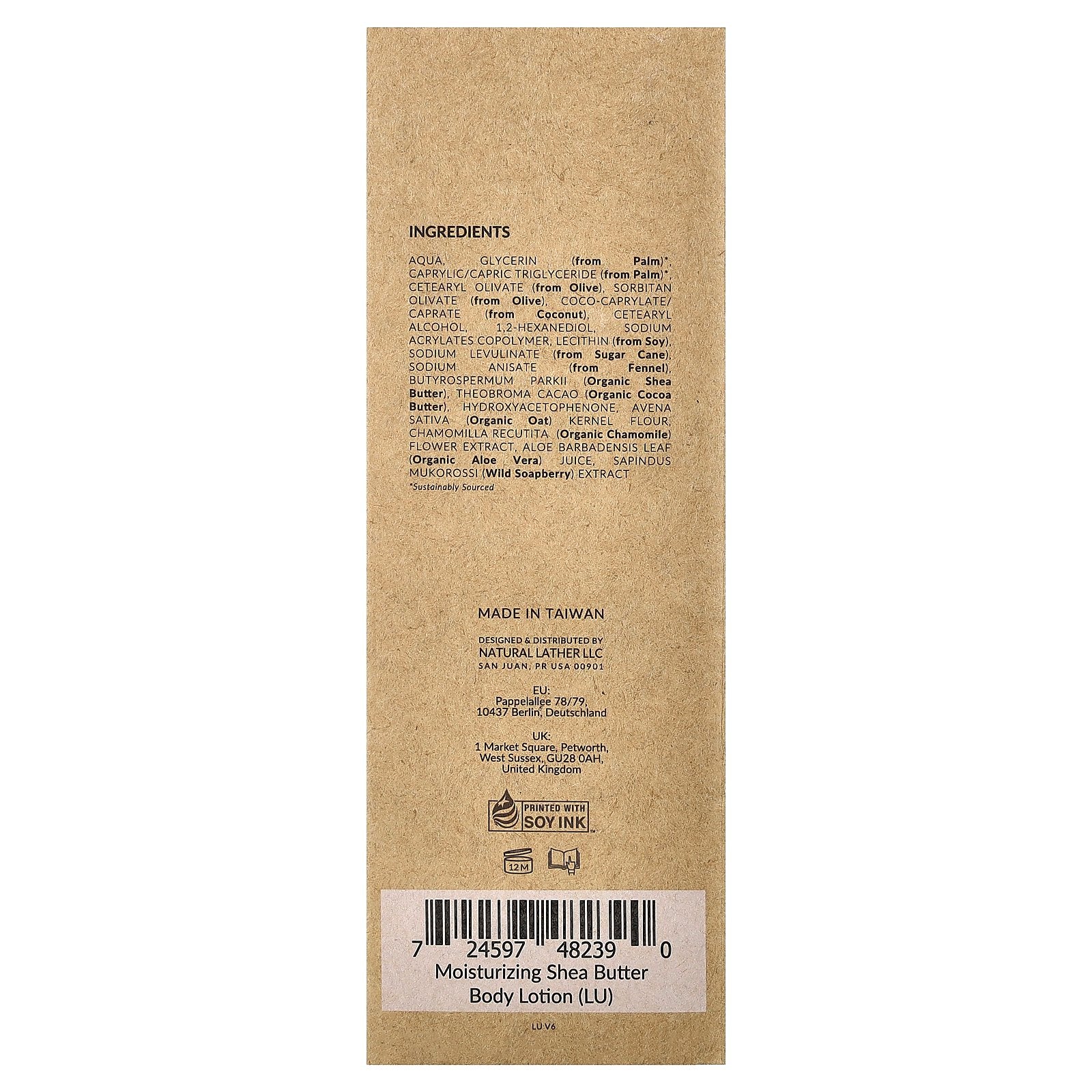 Aqua, glycerin (from palm) caprylic/capric triglyceride (from palm)* cetearyl olivate (from olive), sorbitan olivate (from olive), coco-caprylate/ caprate (from coconut), cetearyl alcohol, 1,2-hexanediol, sodium acrylates copolymer, lecithin (from soy), sodium levulinate (from sugar cane) sodium anisate (from fennel), butyrospermum parkii (organic shea butter), theobroma cacao (organic cocoa butter), hydroxyacetophenone, avena sativa (organic oat) kernel flour chamomilla recutita (organic chamomile) flower extract, aloe barbadensis leaf (organic aloe vera) juice, sapindus mukorossi (wild soapberry) extract.