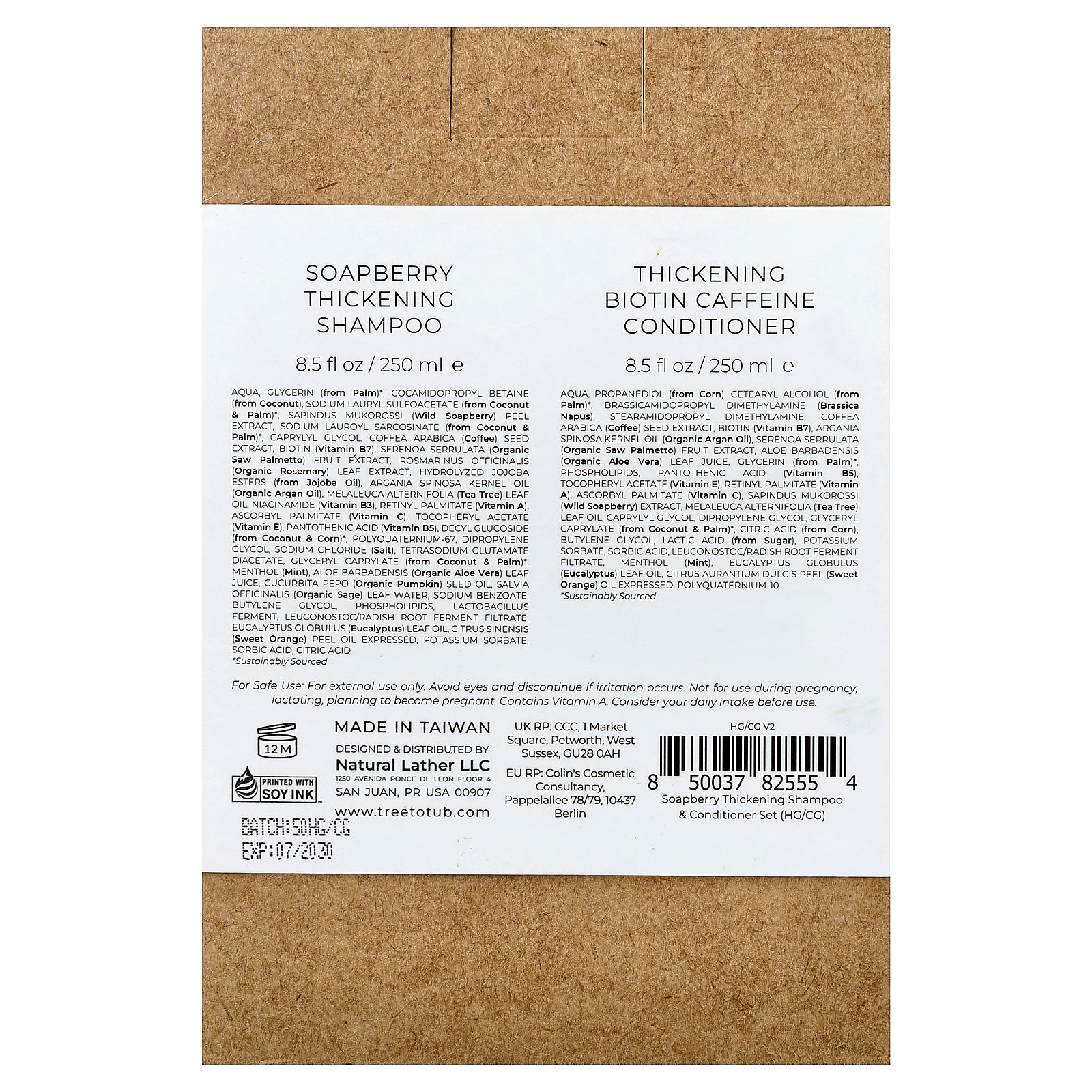 Soapberry Thickening Shampoo: Aqua, glycerin (from palm) *, cocamidopropyl betaine (from coconut), sodium lauryl sulfoacetate (from coconut & palm) *, sapindus mukorossi (wild soapberry) peel extract, sodium lauroyl sarcosinate (from coconut & palm) *, caprylyl glycol, coffea arabica (coffee) seed extract, biotin (vitamin b7), serenoa serrulata (organic saw palmetto) fruit extract, rosmarinus officinalis (organic rosemary) leaf extract, hydrolyzed jojoba esters (from jojoba oil), argania spinosa kernel oil (organic argan oil), melaleuca alternifolia (tea tree) leaf oil, niacinamide (vitamin b3), retinyl palmitate (vitamin a), ascorbyl palmitate (vitamin c), tocopheryl acetate (vitamin e), pantothenic acid (vitamin b5), decyl glucoside (from coconut & corn) *, polyquaternium-67, dipropylene glycol, sodium chloride (salt), tetrasodium glutamate diacetate, glyceryl caprylate (from coconut & palm) *, menthol (mint), aloe barbadensis (organic aloe vera) leaf juice, cucurbita pepo (organic pumpkin) seed oil, salvia officinalis (organic sage) leaf water, sodium benzoate, butylene glycol, phospholipids, lactobacillus ferment, leuconostoc/radish root ferment filtrate, eucalyptus globulus (eucalyptus) leaf oil, citrus sinensis (sweet orange) peel oil expressed, potassium sorbate, sorbic acid, citric acid.