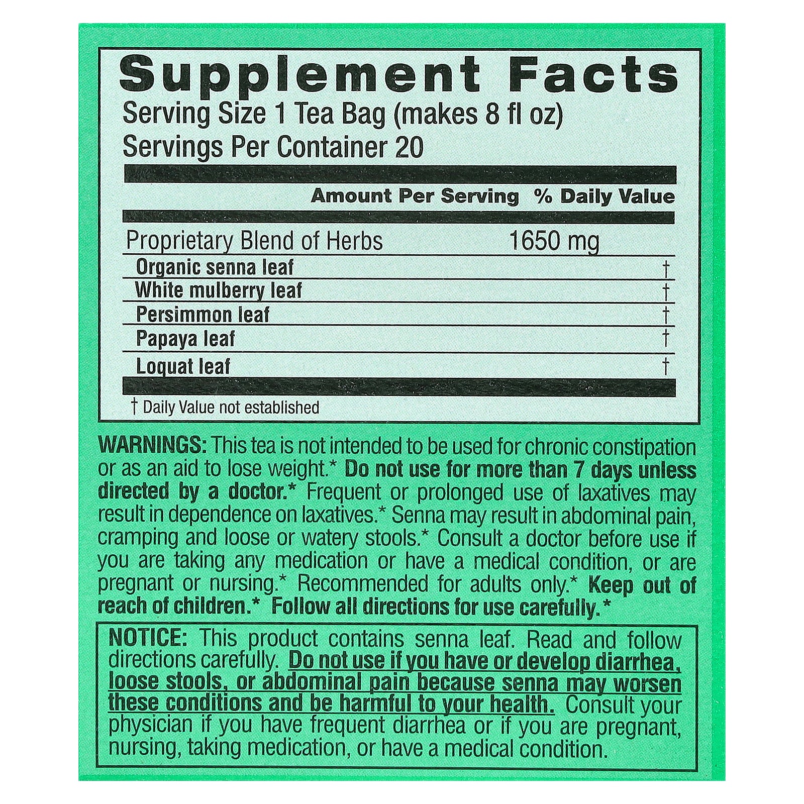 This tea is not intended to be used for chronic constipation or as an aid to lose weight. Do not use for more than 7 days unless directed by a doctor. Frequent or prolonged use of laxatives may result in dependence on laxatives. Senna may result in abdominal pain, cramping and loose or watery stools. Consult a doctor before use if you are taking any medication or have a medical condition, or are pregnant or nursing. Recommended for adults only. Keep out of reach of children. Follow all directions for use carefully.