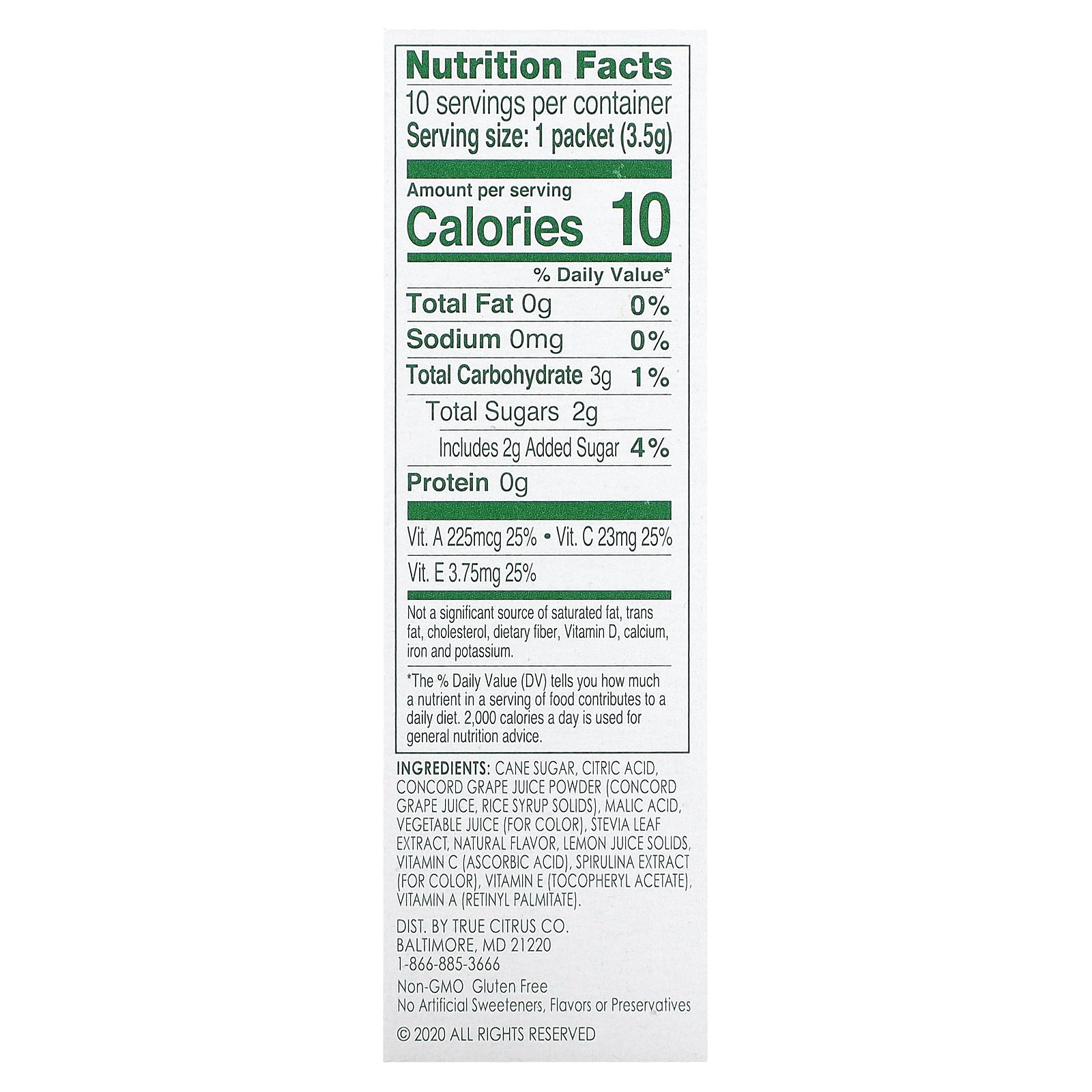 Cane sugar, citric acid, concord grape juice powder (concord grape juice, rice syrup solids), malic acid, vegetable juice (for color), stevia leaf extract, natural flavor, lemon juice solids, vitamin c (ascorbic acid), spirulina extract (for color), vitamin e (tocopheryl acetate), vitamin a (retinyl palmitate).
