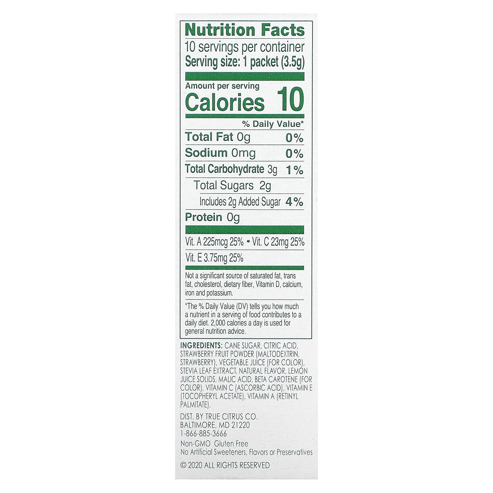 Cane sugar, citric acid strawberry fruit powder (maltodextrin, strawberry), vegetable juice (for color), stevia leaf extract, natural flavor, lemon juice solids, malic acid, beta carotene (for color), vitamin c (ascorbic acid), vitamin e (tocopheryl acetate), vitamin a (retinyl palmitate).