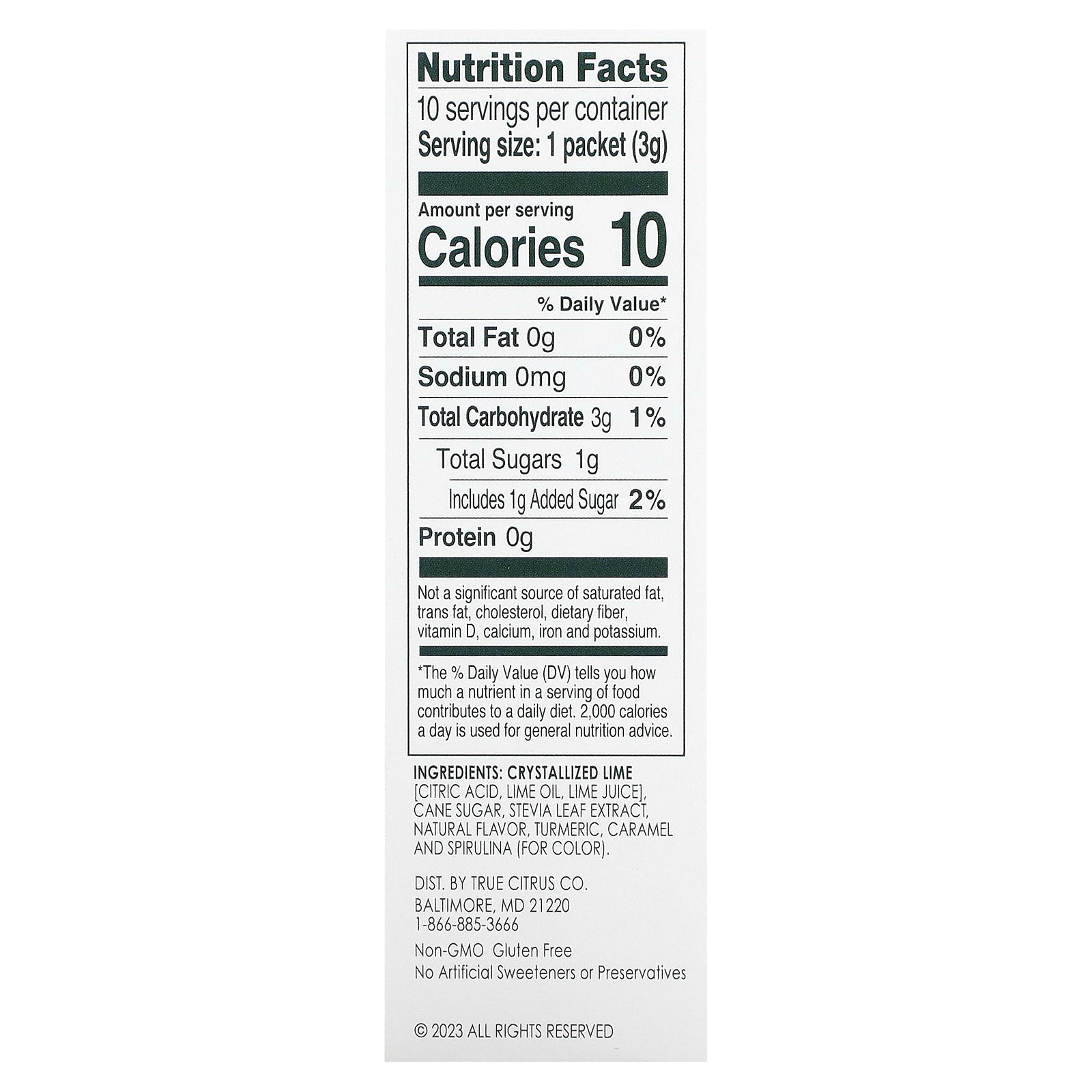 Crystallized lime [citric acid, lime oil, lime juice], cane sugar, stevia leaf extract, natural flavor, turmeric, caramel and spirulina (for color).