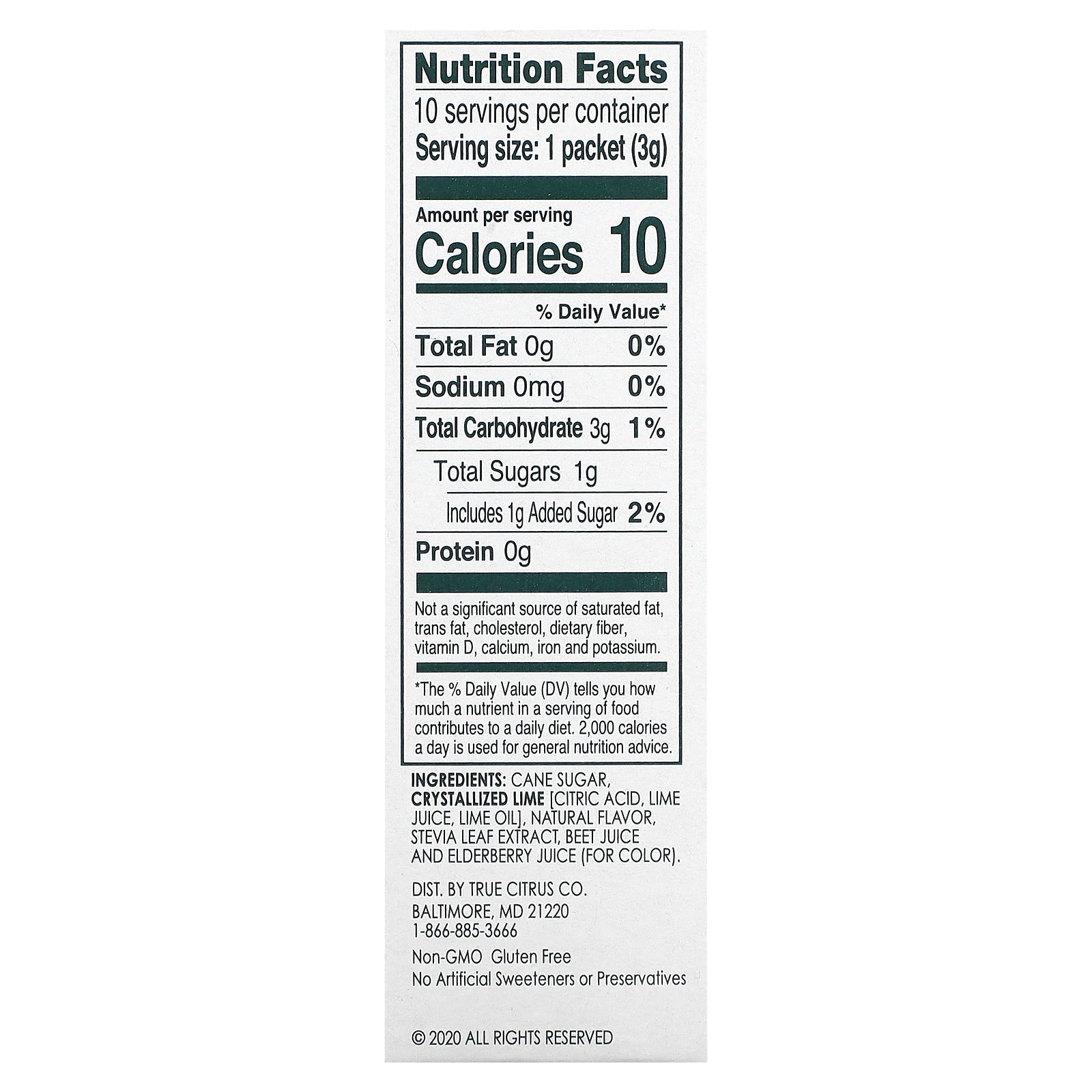 Cane sugar, crystallized lime (citric acid, lime juice, lime oil), natural flavor, stevia leaf extract, beet juice and elderberry juice (for color).