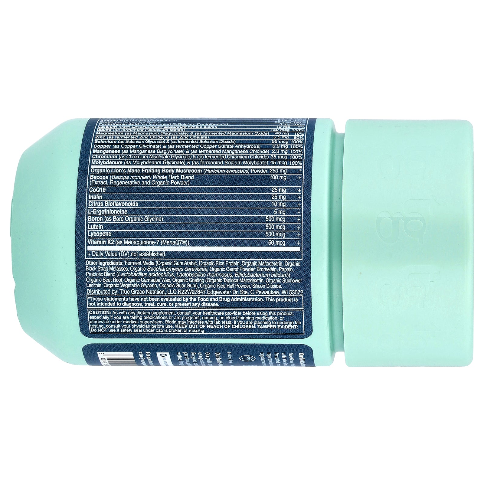 True Grace whole food based multivitamins are formulated with intention using fermented vitamins, chelated and fermented minerals, organic medicinal lion's mane, regenerative and organic bacopa, along with CoQ10 and ergothioneine to support cellular energy.