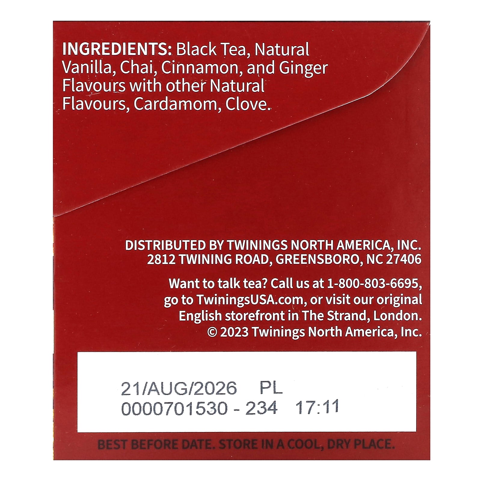 Black tea, natural vanilla, chai, cinnamon, and ginger flavours with other natural flavours, cardamom, clove.