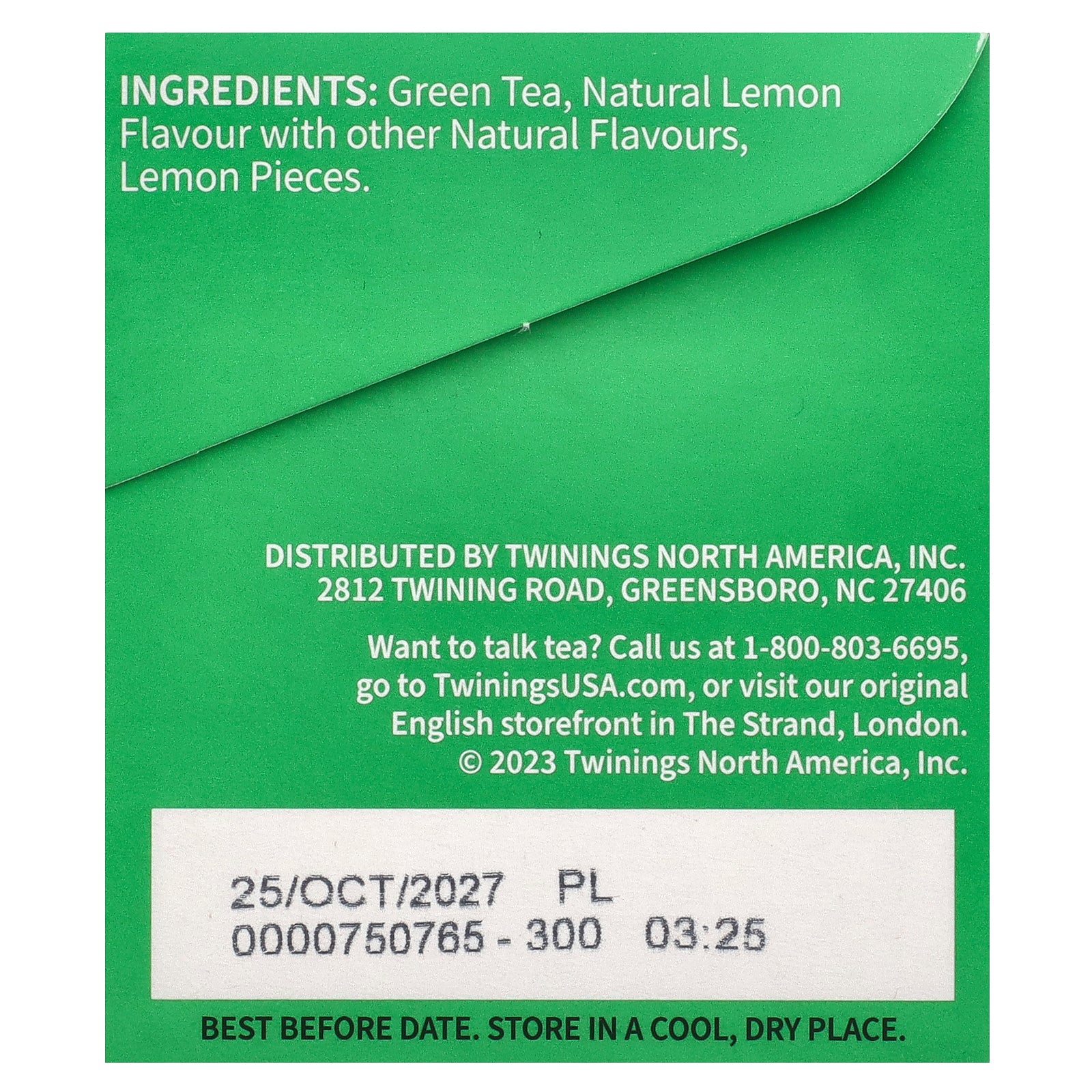 Green tea, natural lemon flavour with other natural flavours, lemon pieces.